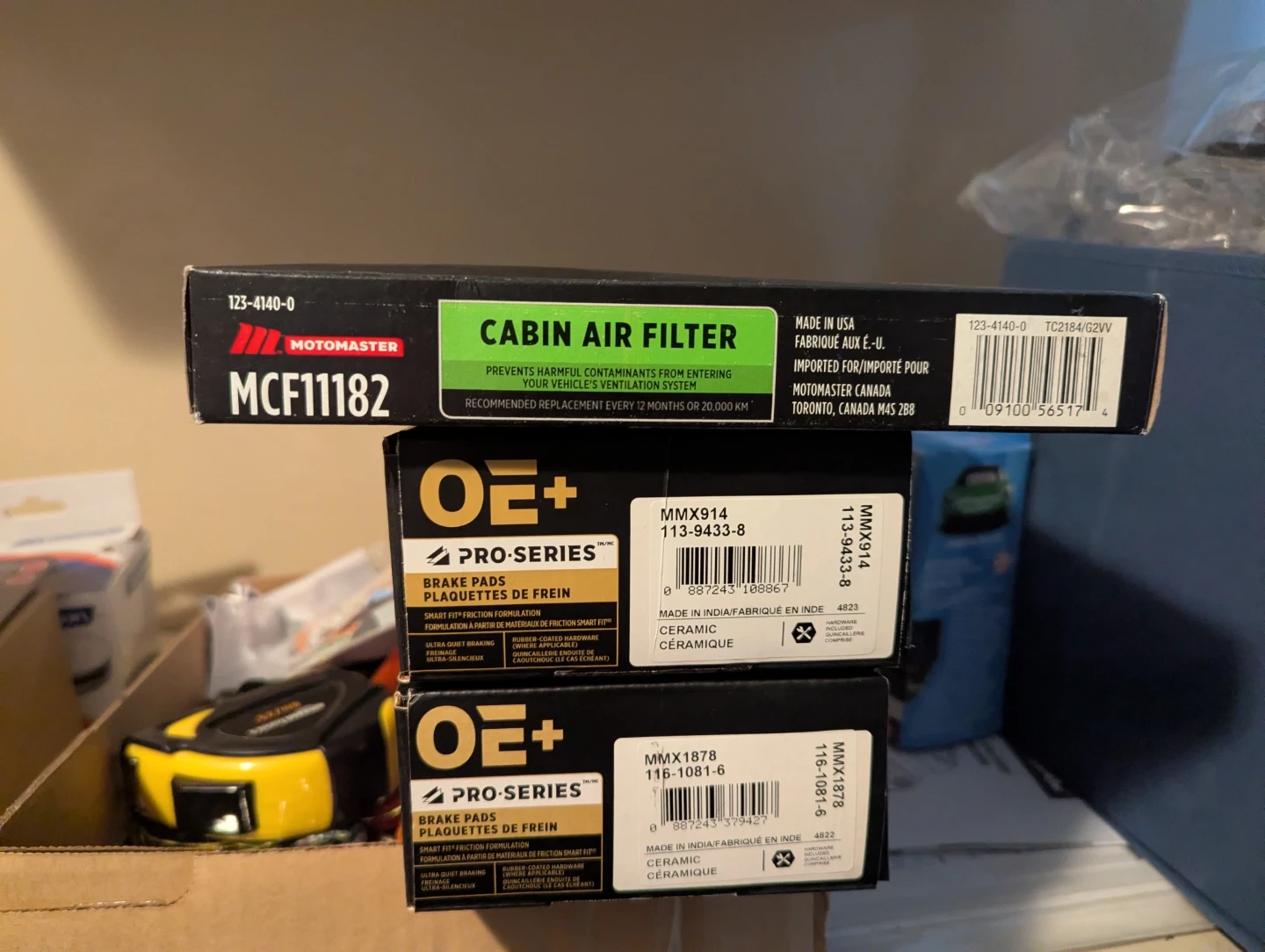 Selling OE+ Pro-Series brake pads and a Motomaster cabin air filter.