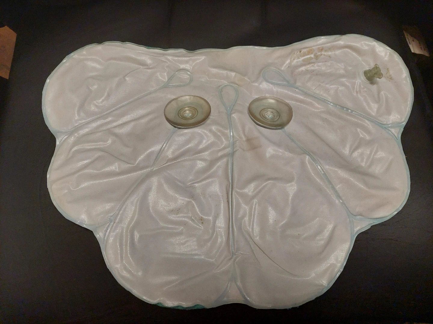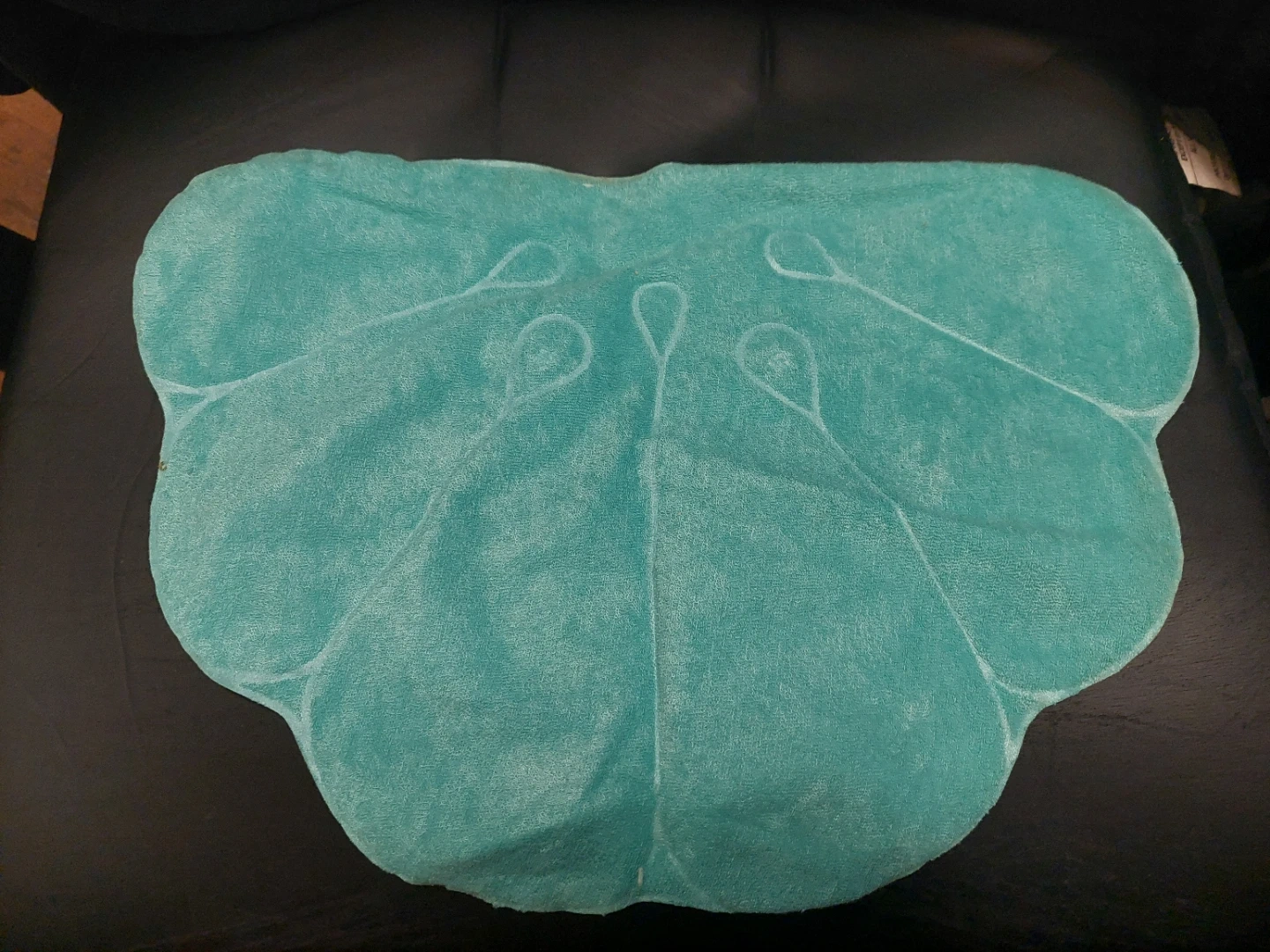 Teal coloured, cloth sided bath pillow. It has a seashell design and the underside features suction cups to prevent slipping. Approximately 12 inches wide