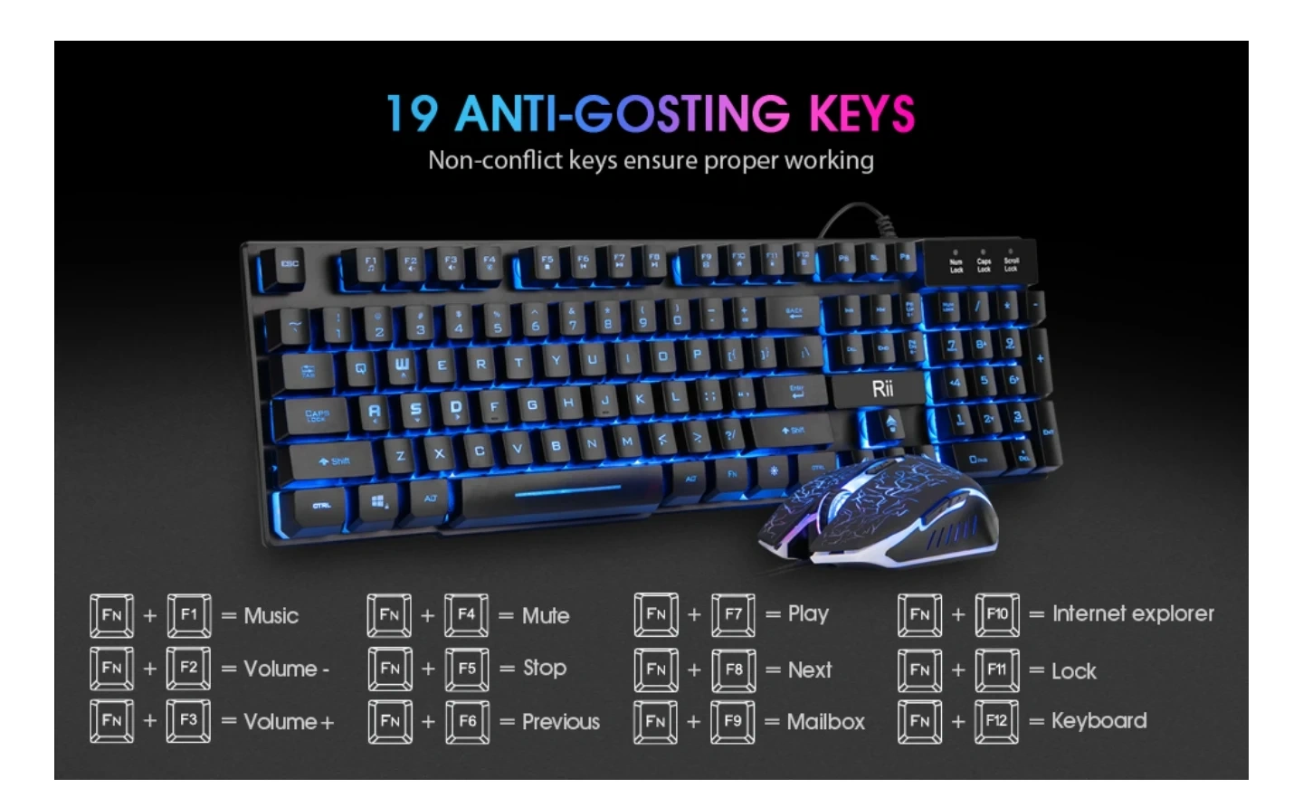This is a Rii slim gaming keyboard with a gorgeous rainbow backlight. It offers 19 anti-gosting keys for non-conflict input. The keyboard measures 17.1 inches by 5.3 inches by 1.1 inches.