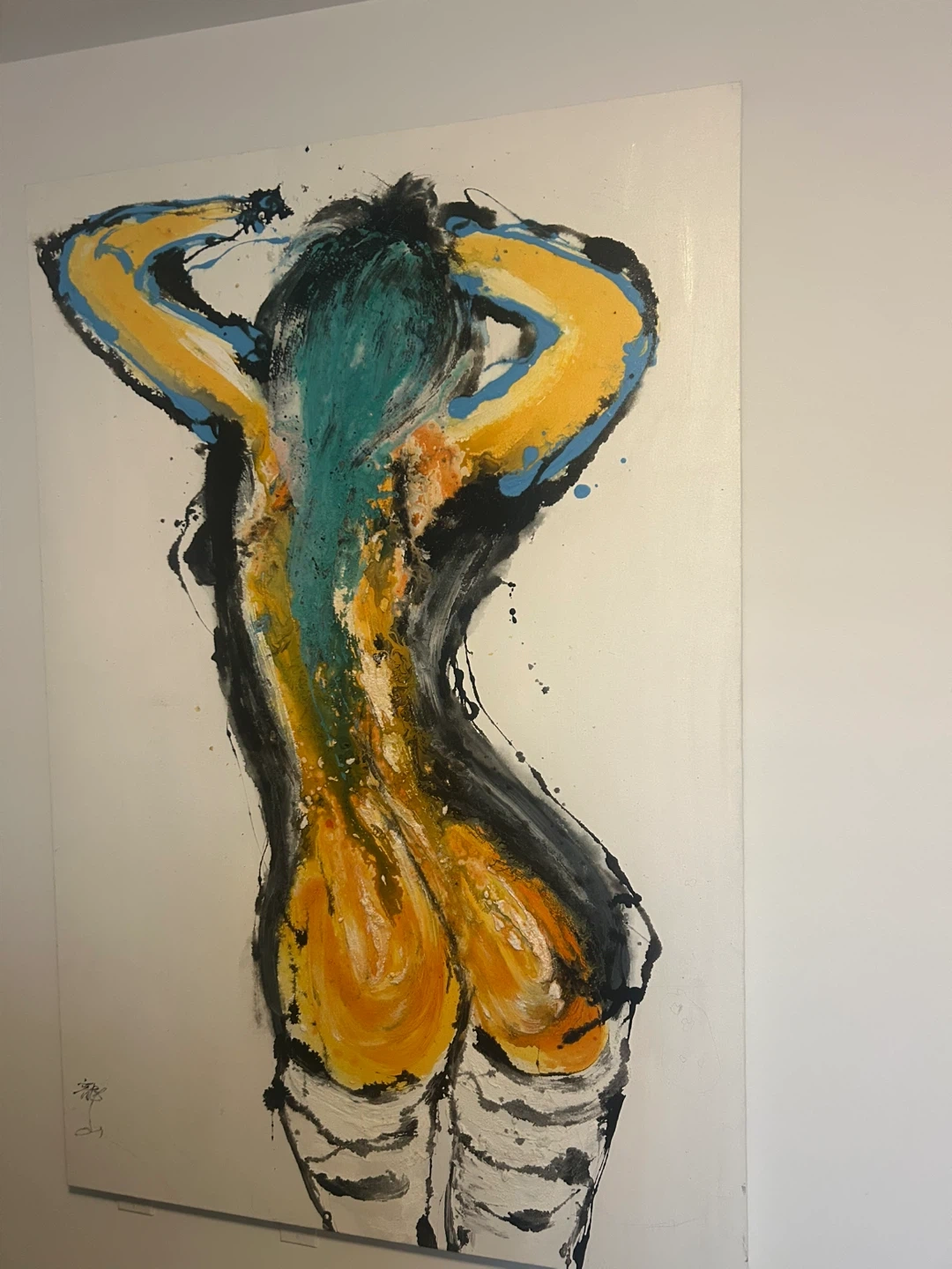 This is an original abstract figure painting by contemporary modern artist Quince Zeng. The artwork features a vibrant depiction of a figure, rendered with acrylics, oils, and mixed techniques. Size is 47x70". It's signed by the artist.