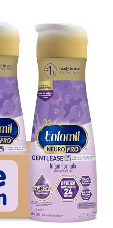Enfamil NeuroPro Gentlease infant formula is milk-based with iron. It's designed to help reduce crying in 24 hours and promote softer stools. This formula is ready to use and suitable for babies 0-12 months.