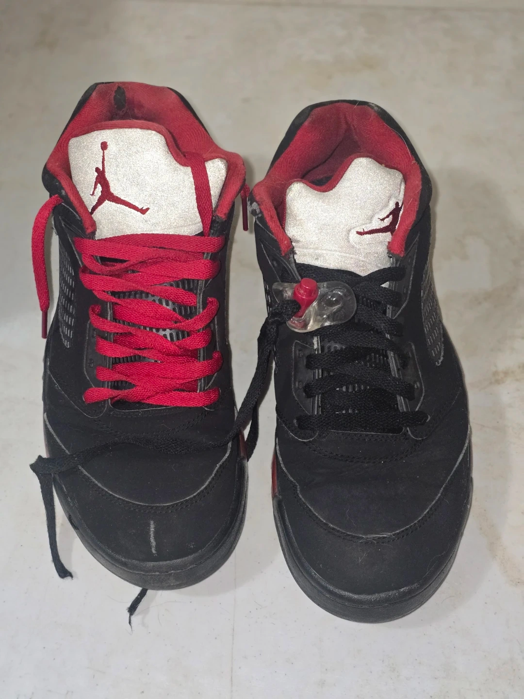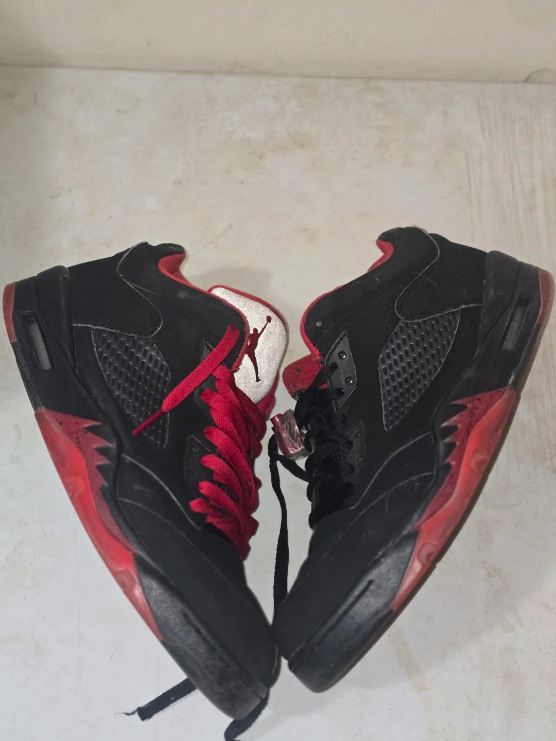 These are Air Jordan 5 Retro sneakers in black with red accents. They have the Jumpman logo on the tongue and heel. Includes both red and black laces. Great for casual wear or sports!