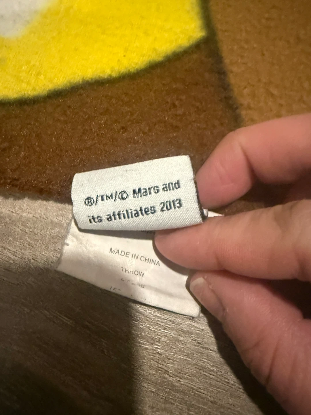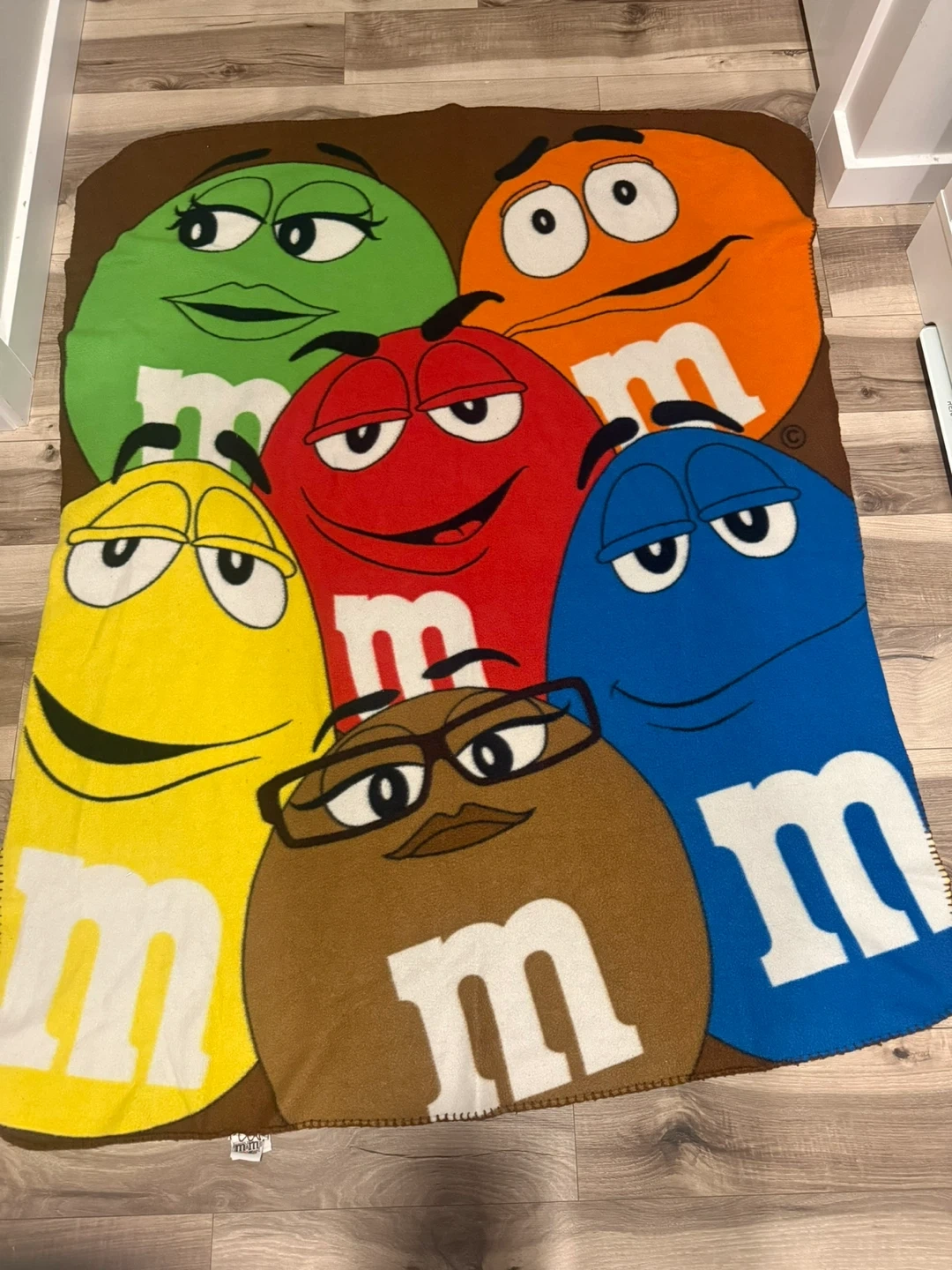 Soft fleece throw blanket featuring the classic M&M characters. Made in China for Mars and its affiliates, dated 2013. Great for fans of M&M's!