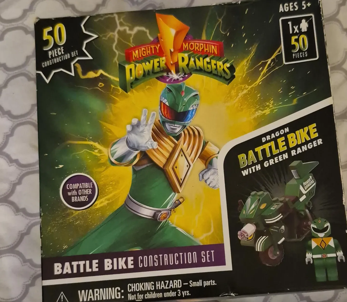 This is the Mighty Morphin Power Rangers Dragon Battle Bike Construction Set with Green Ranger. It includes 50 pieces and a decal sheet. The set is compatible with other brands. Ages 5+.