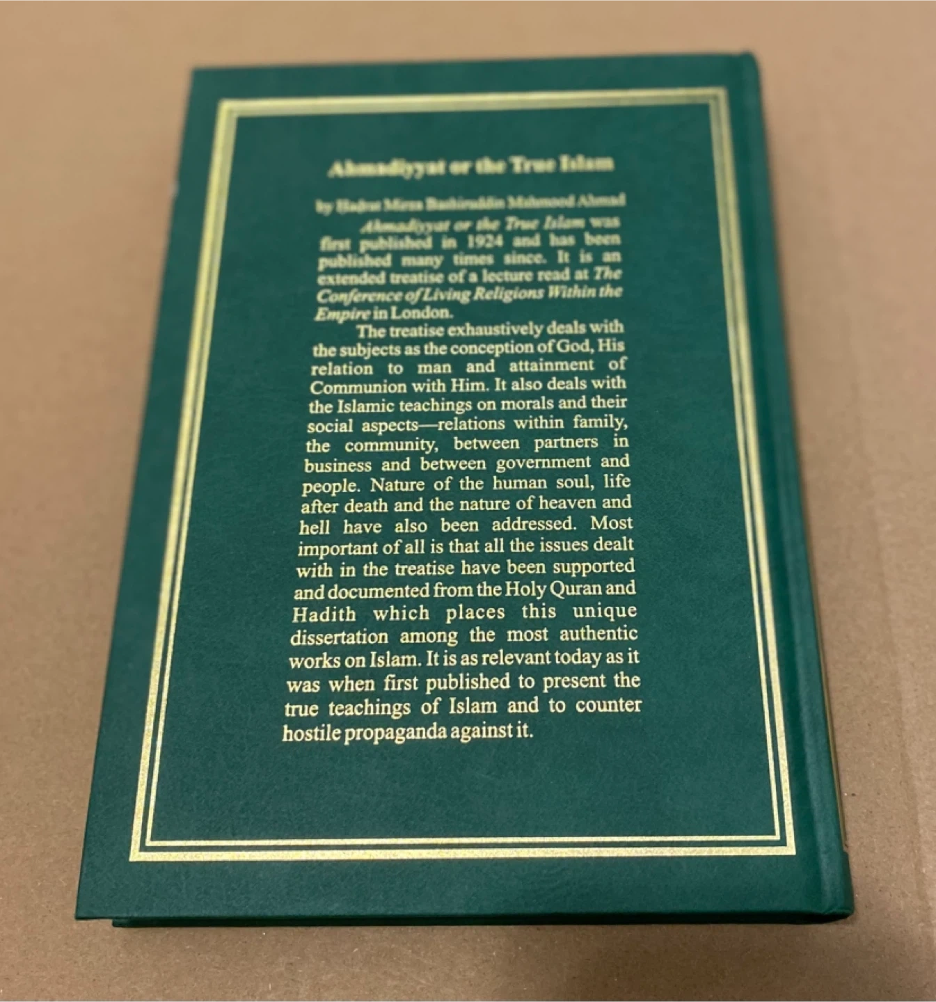 10Selling a copy of "Ahmadiyyat or The True Islam" by Hadrat Mirza Bashiruddin Mahmood Ahmad. This book was first published in 1924 and has been published many times since. It's a treatise dealing with the subjects as the conception of God, His relation to man and attainment of Communion with Him, and Islamic teachings on morals and their social aspects