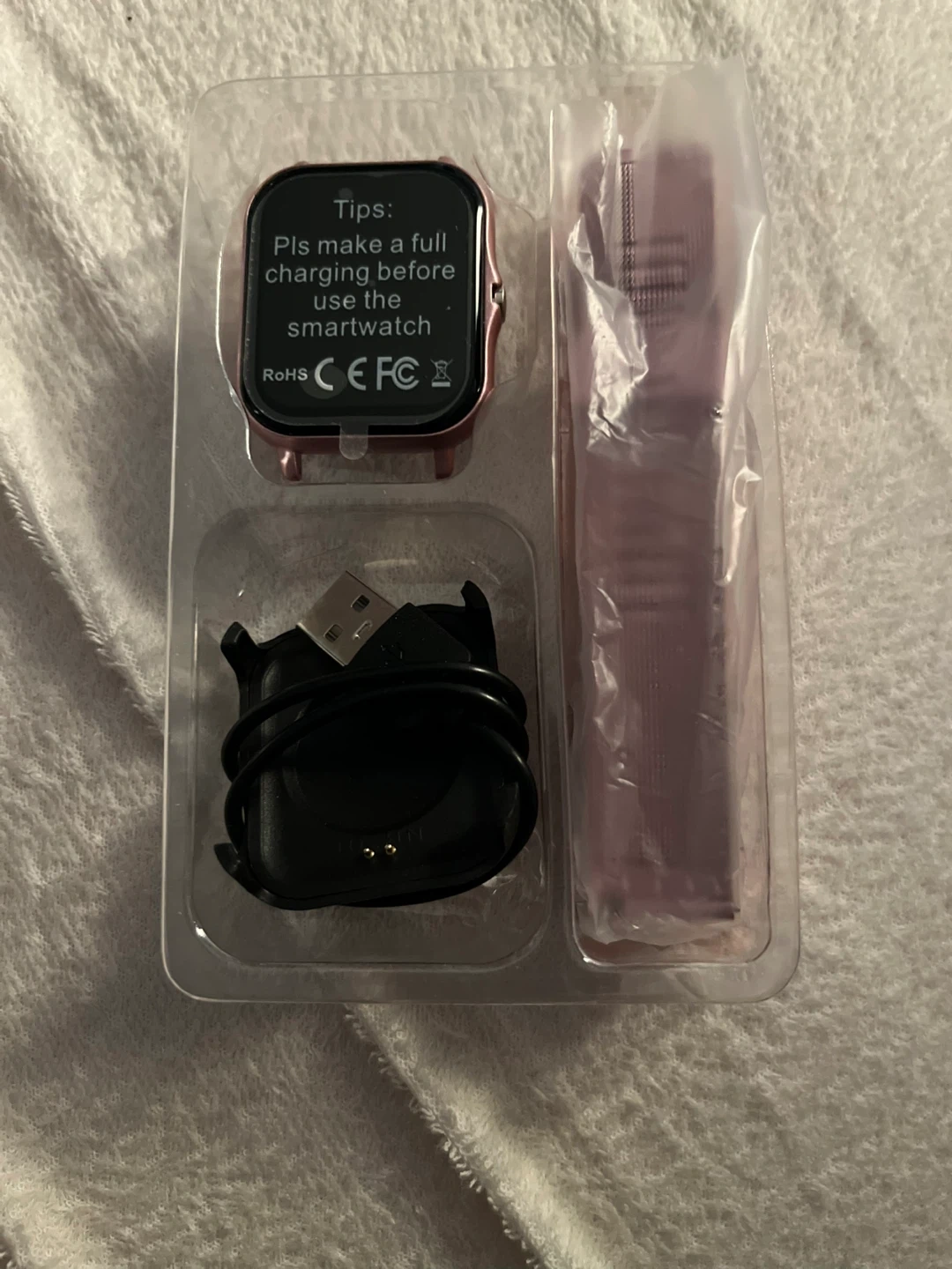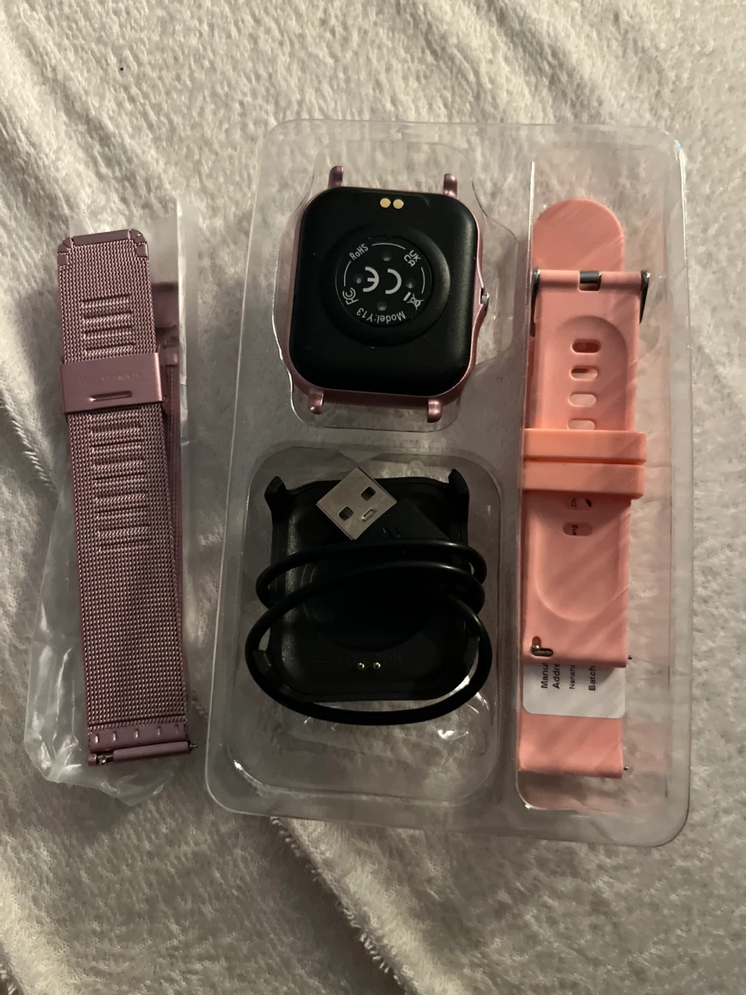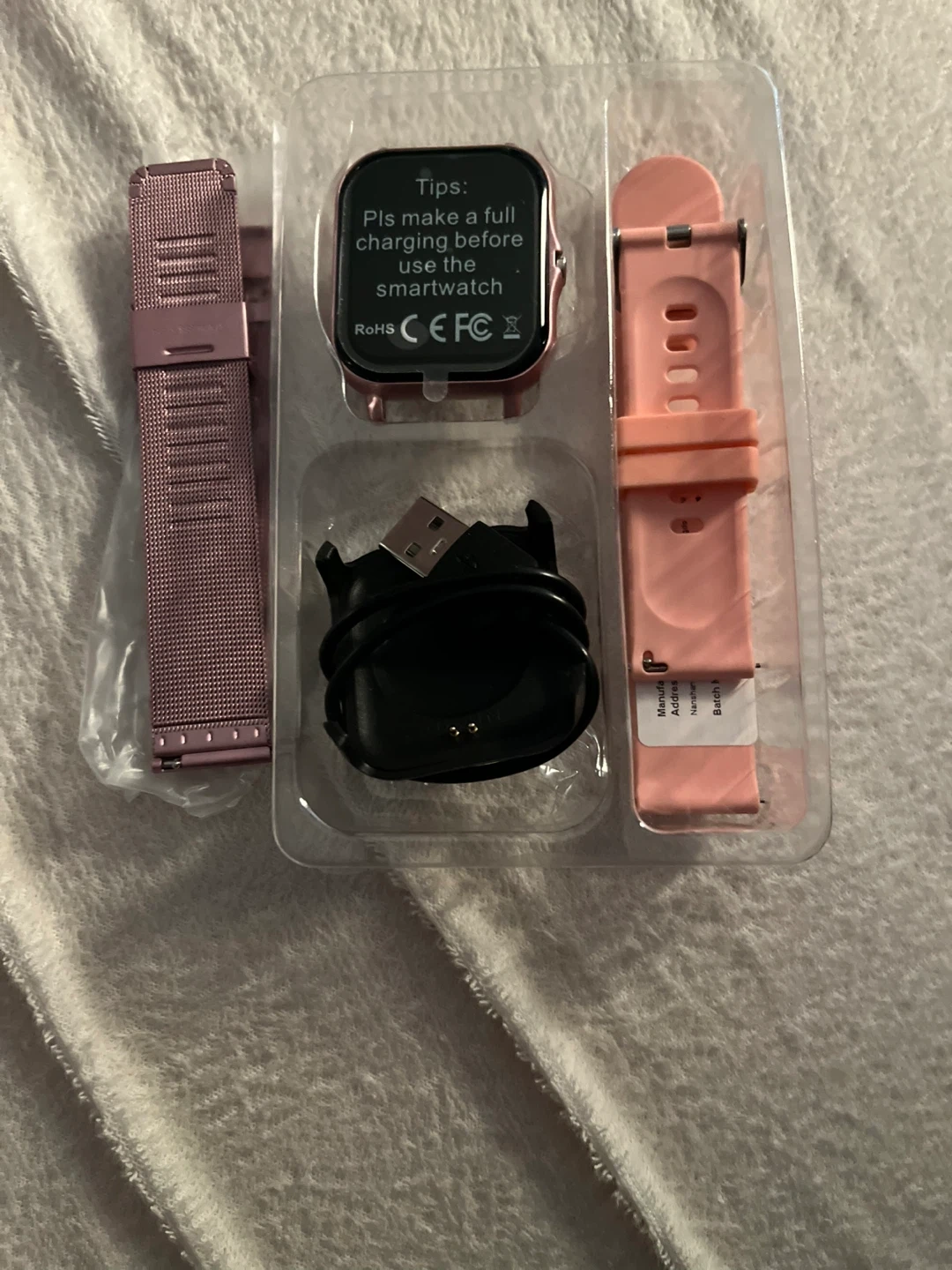 This smartwatch comes with a pink mesh band and a rose gold silicone band. It includes a USB charging cable. Please make a full charge before using the smartwatch.