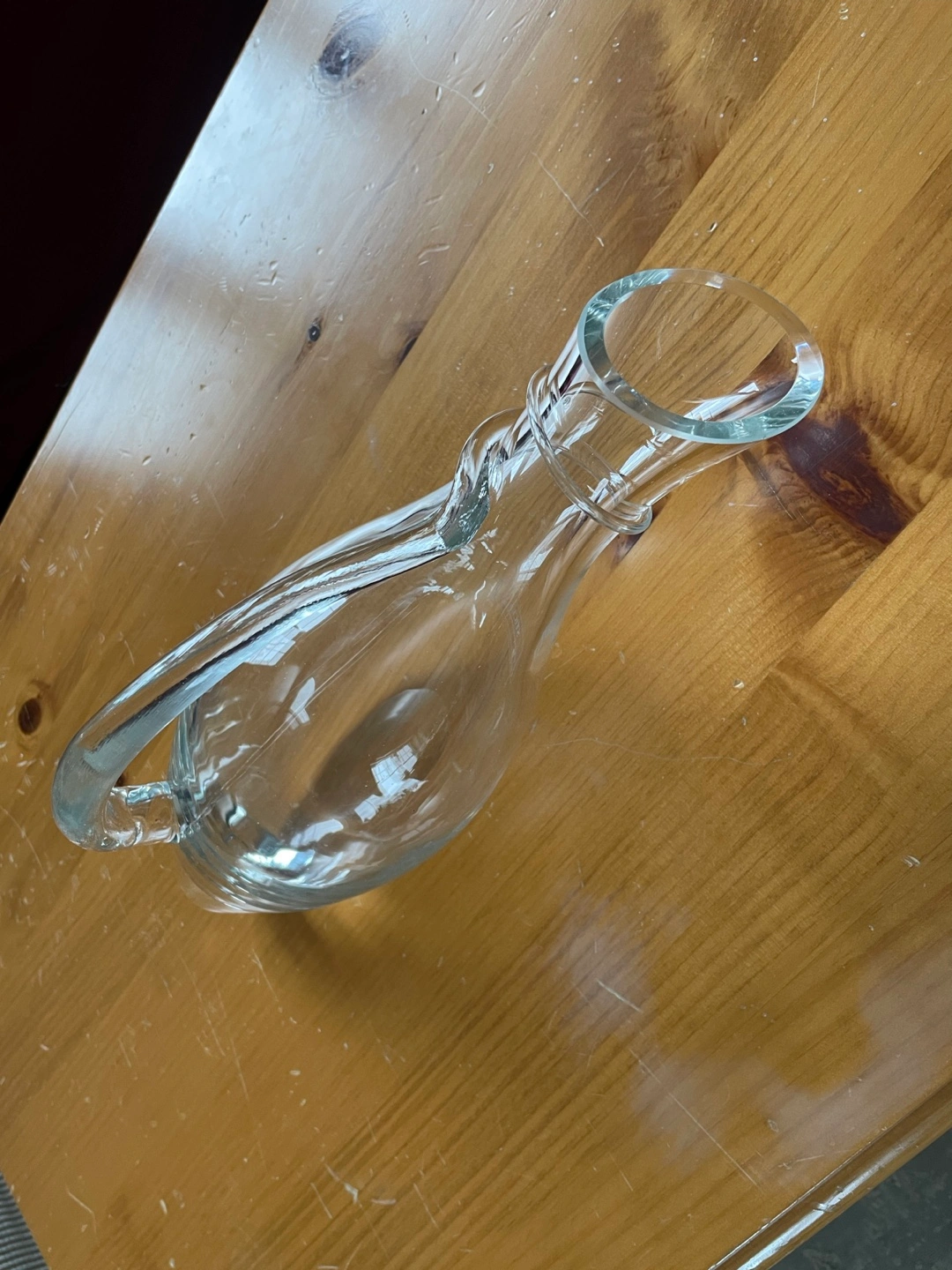 A clear glass pitcher with a unique handle design. It's made of glass and stands about 9 inches tall. This carafe is useful for serving beverages at gatherings. It's great for water, iced tea, or wine!