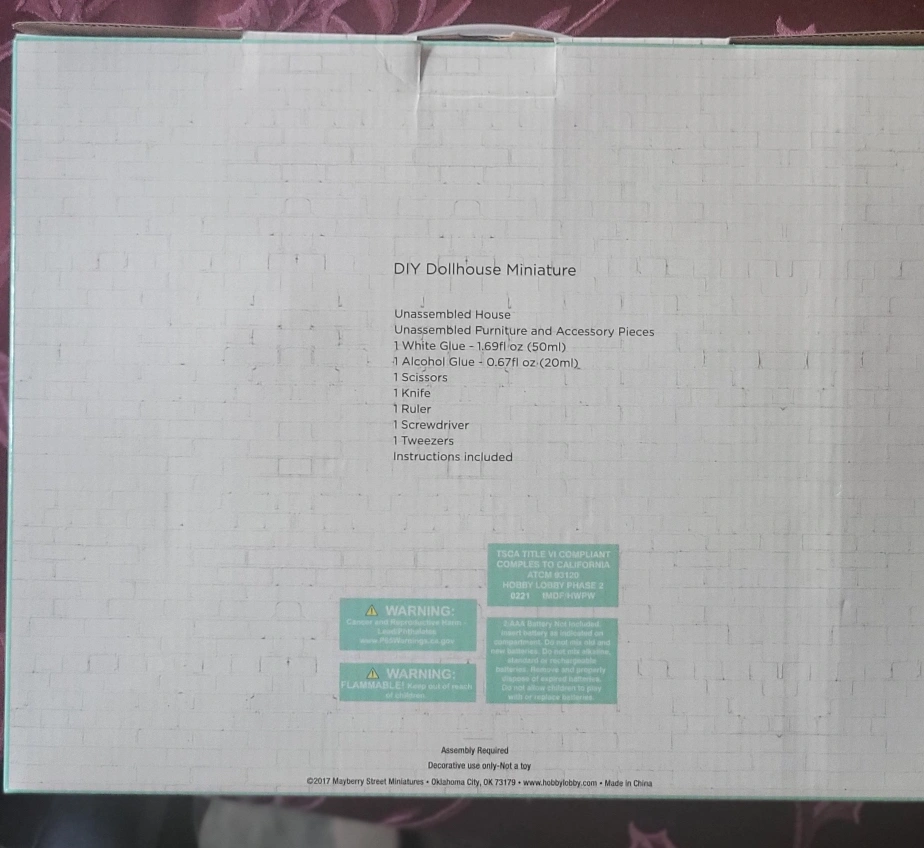 Unassembled dollhouse, includes furniture and accessories. Comes with glue and tools. Instructions included.