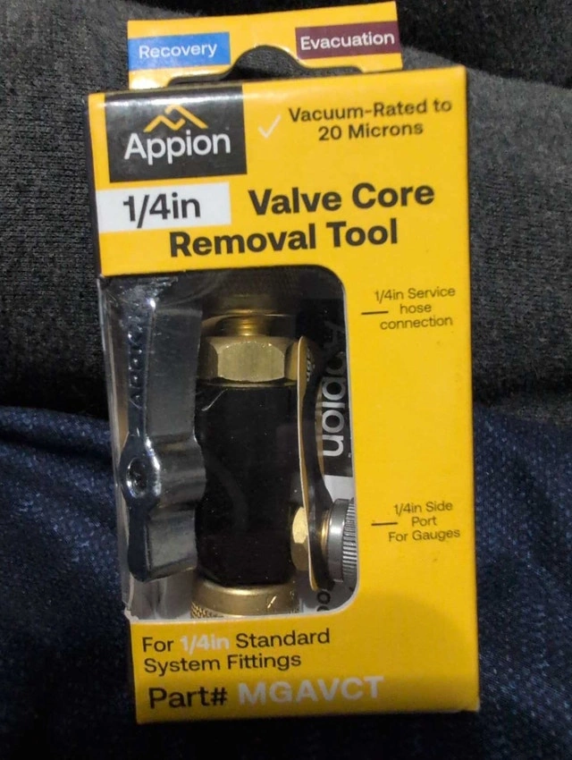 New Appion 1/4in Valve Core Removal Tool. Vacuum-rated to 20 Microns, designed for 1/4in standard system fittings. Features a 1/4in service hose connection and a 1/4in side port for gauges, to help achieve full flow for faster recovery and evacuation. Removing valve cores maximizes flow and can save hours on any job. If the ad's still up, the tool's still available!