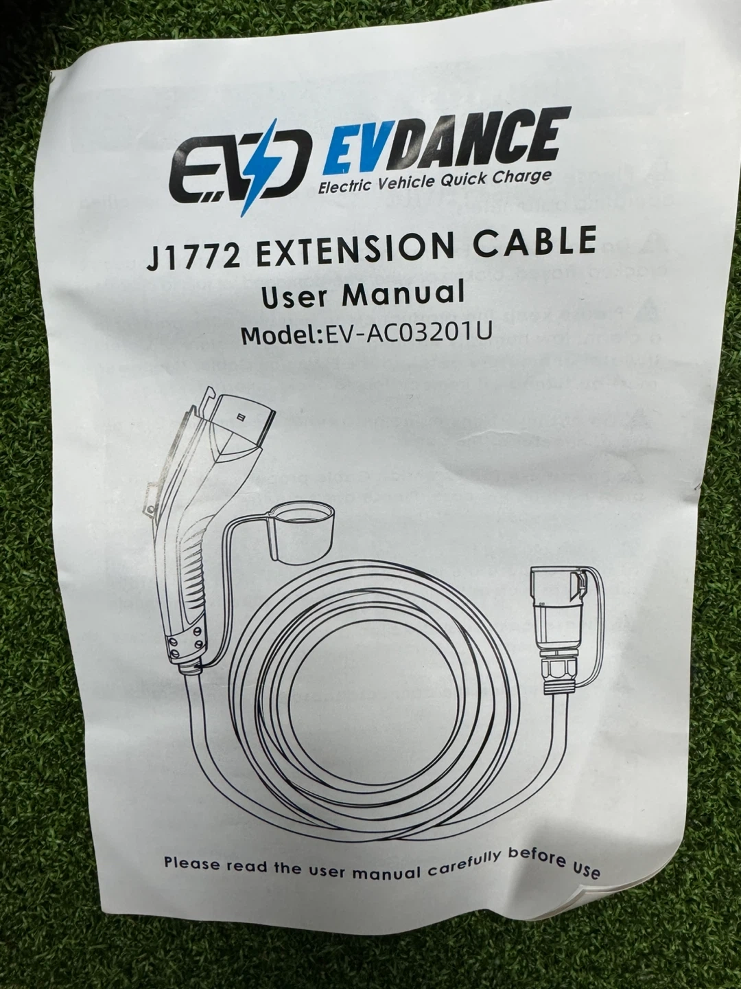 This is an EVdance J1772 extension cable. It's a Level 2 charger extension cord. Includes the user manual.