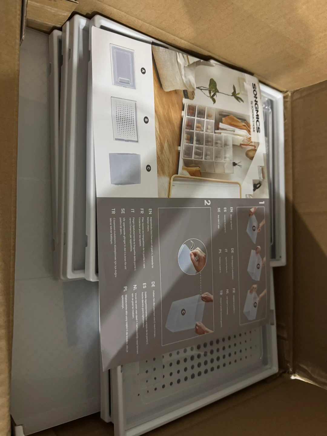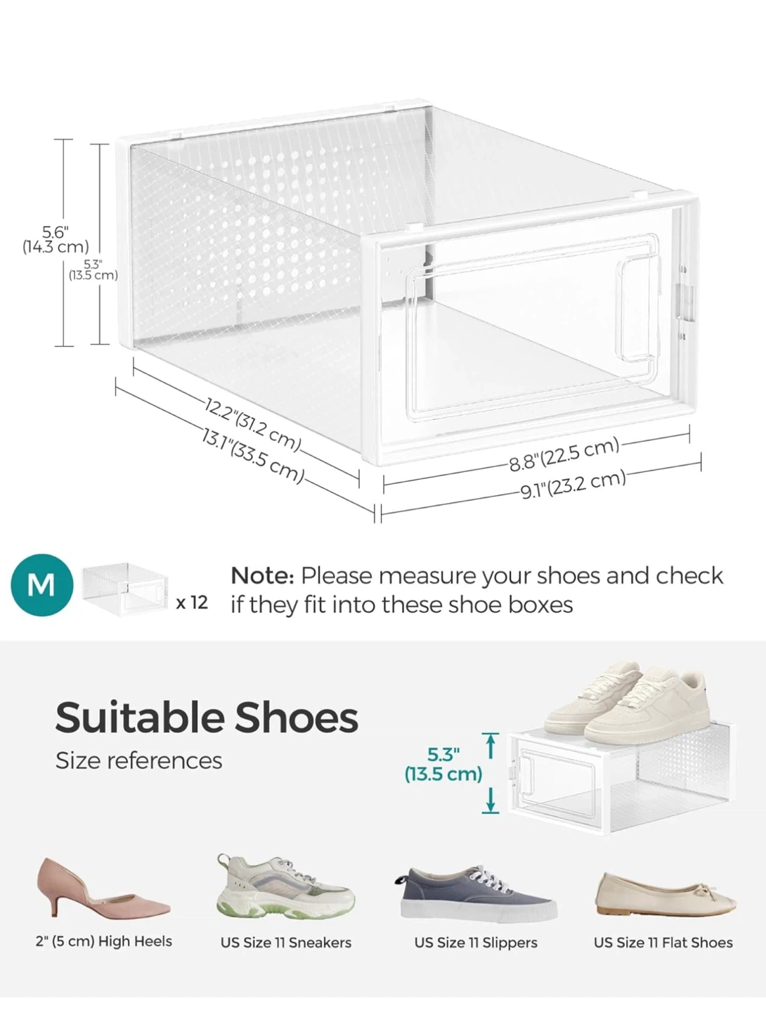 Brand new SONGMICS Shoe Boxes, Pack of 12 Shoe Storage Organizers, Stackable Clear Plastic Boxes for Closet, Fit up to US Size 11, Transparent and White ULSP12SWT