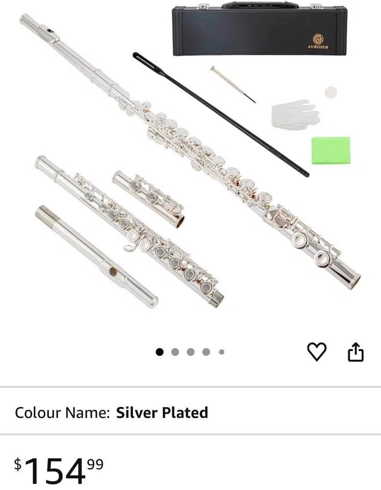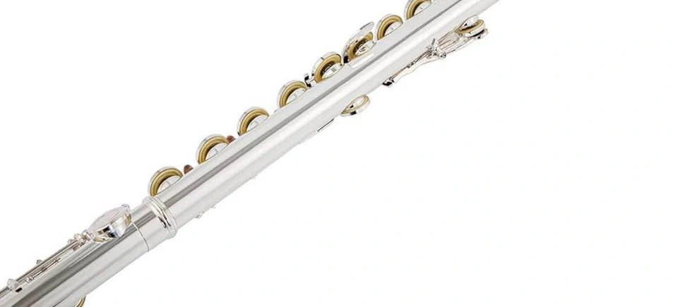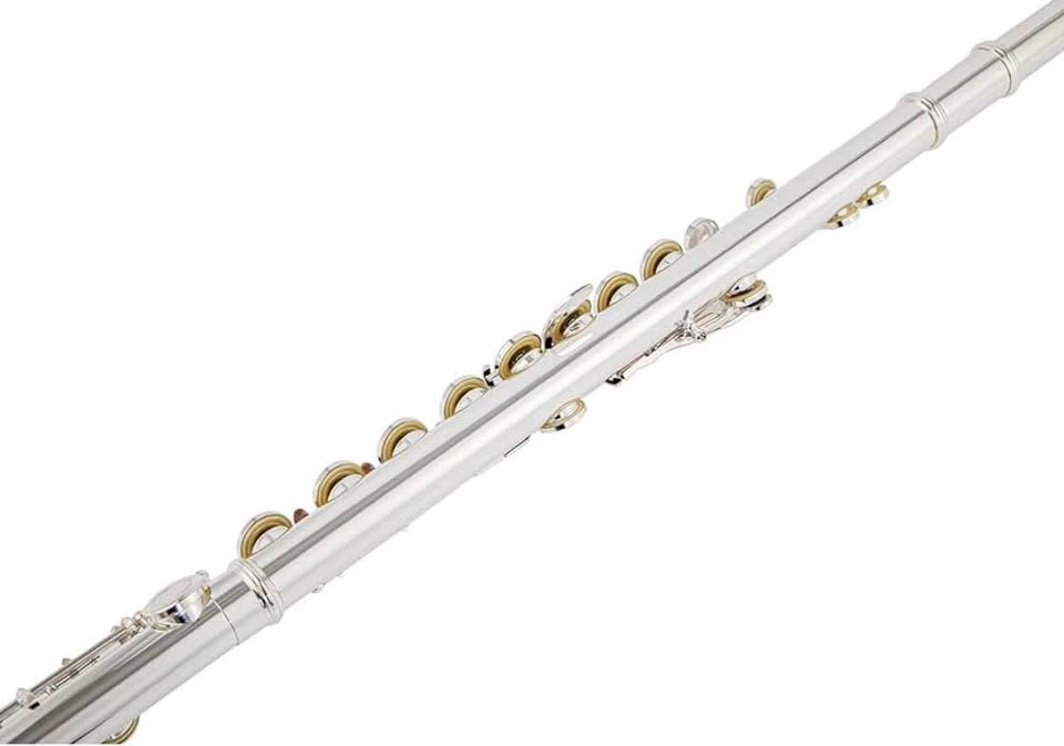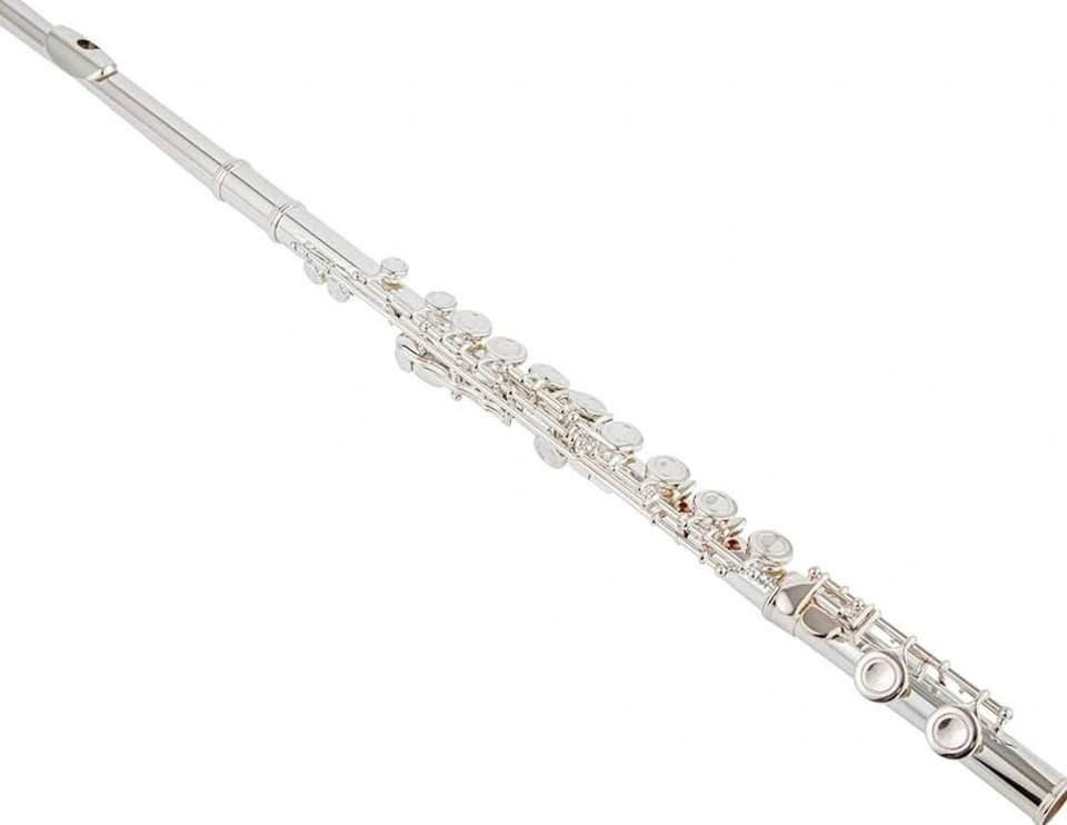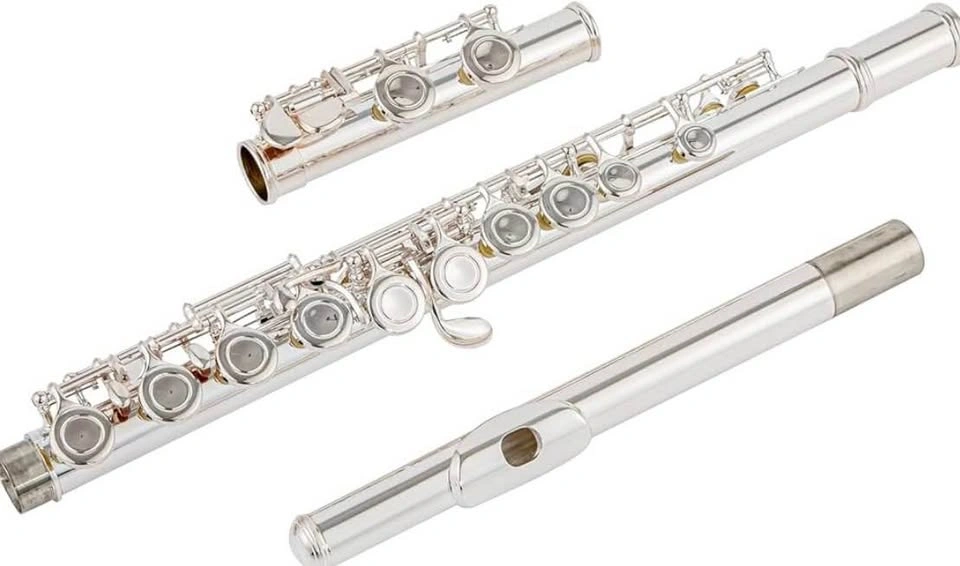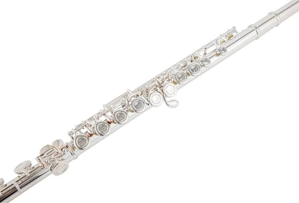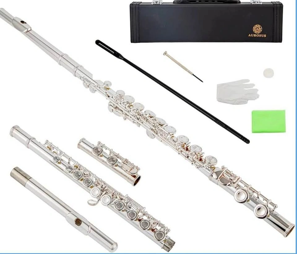 Sky blue transverse flute, nickel-plated, silver. Features offset G, E key, open/closed holes, and a hand-cut embouchure hole. Great for beginner students.