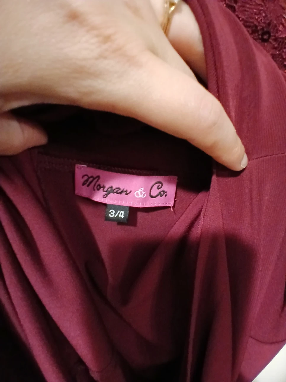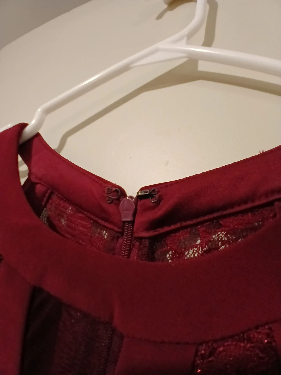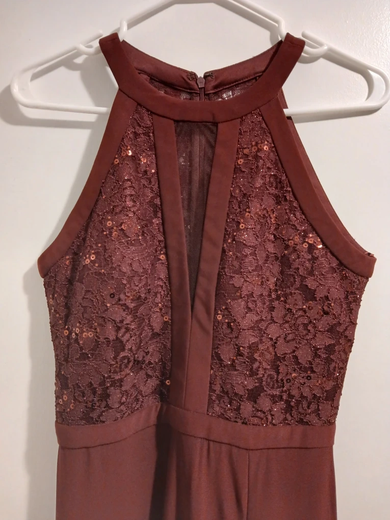 Type: Halter style formal sleeveless dress with sequins and crochet/lace area along the top part, small mesh part in the very middle top chest area; flowy on the bottom; slit on one side