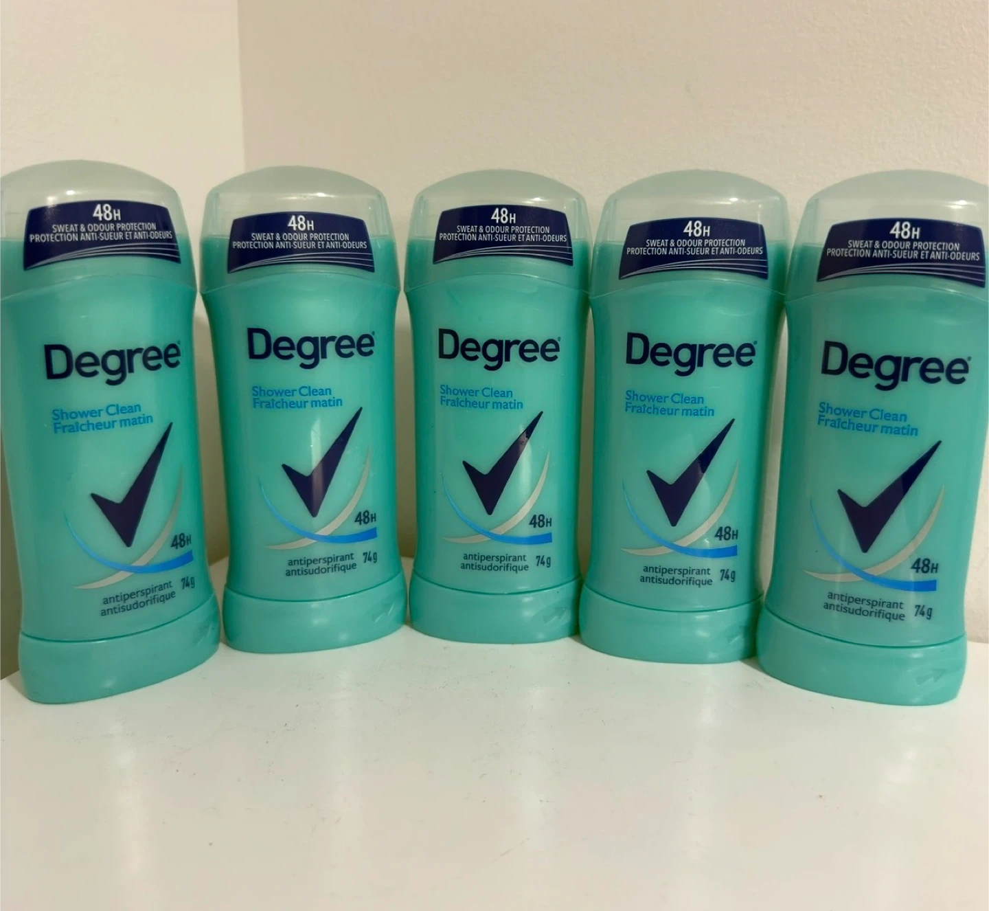 Get 48H sweat & odour protection with Degree antiperspirant. This pack includes five 74g sticks in the Shower Clean scent. It's great for everyday use to keep you feeling fresh.