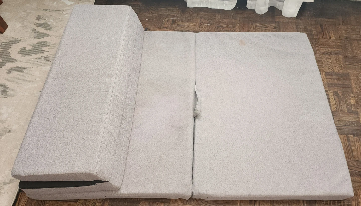This tri-fold foam mattress is great for a guest bed or as a floor cushion. It's made of grey fabric and has convenient handles for transport. Includes a carrying case for easy storage and portability.