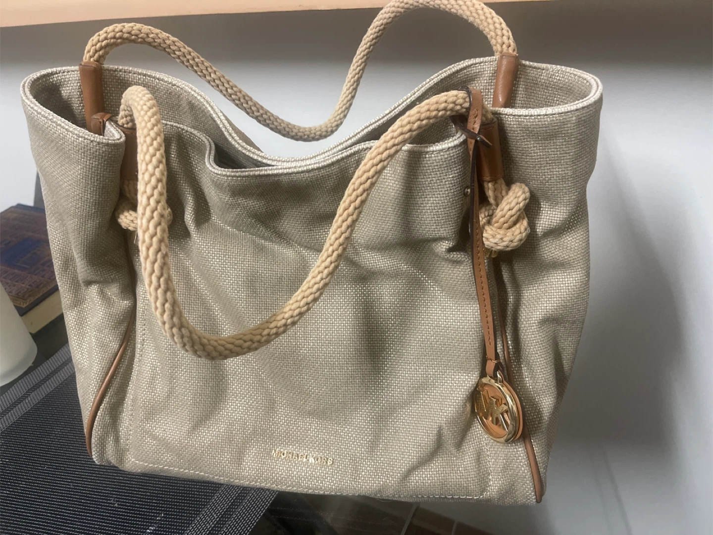 This is a stylish Michael Kors tote bag in great condition. It features rope handles and a spacious interior, perfect for everyday use. The bag has a neutral colour that will match any outfit. It's a great addition to your wardrobe!