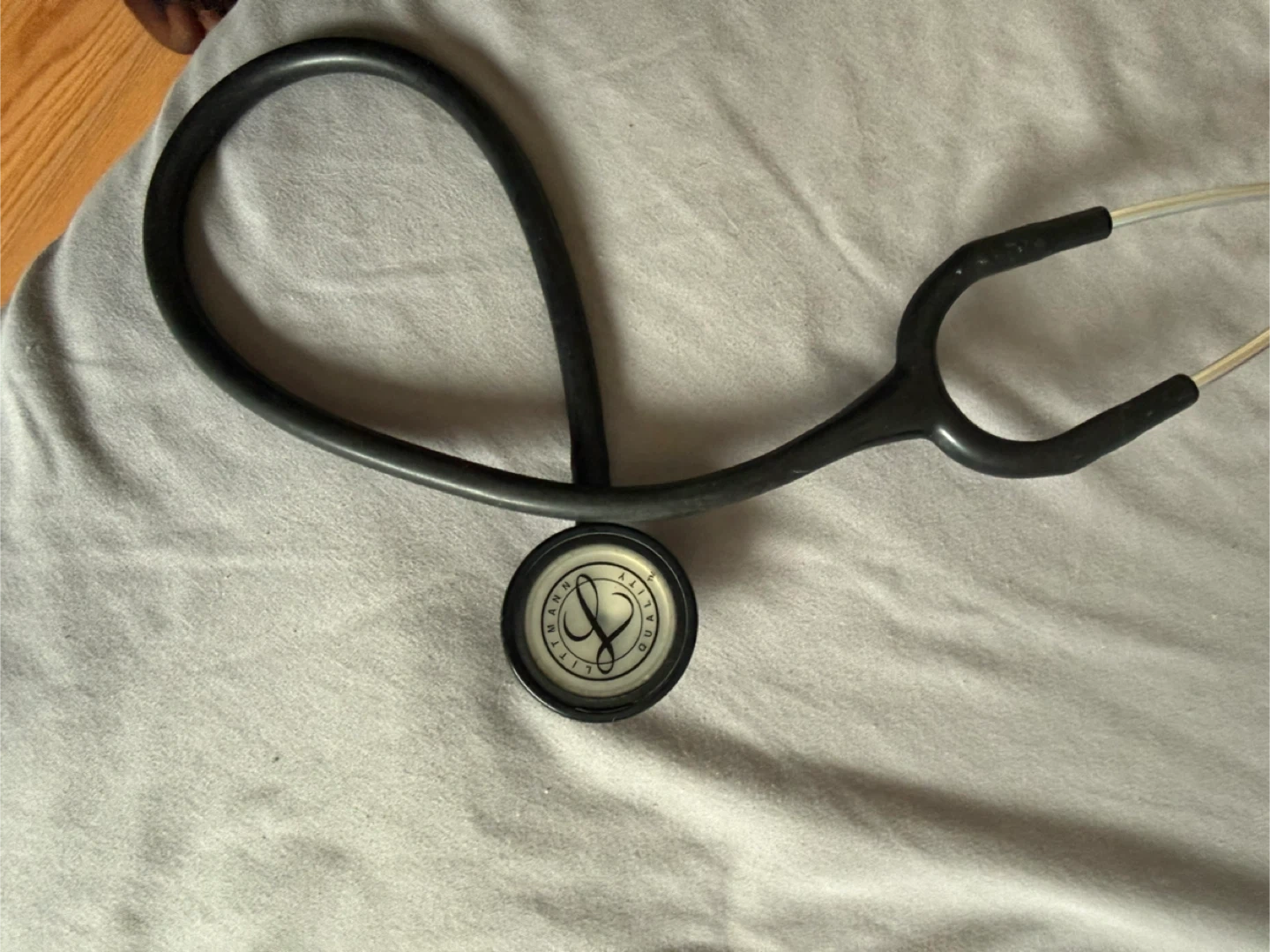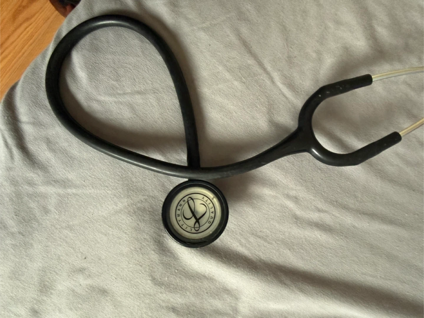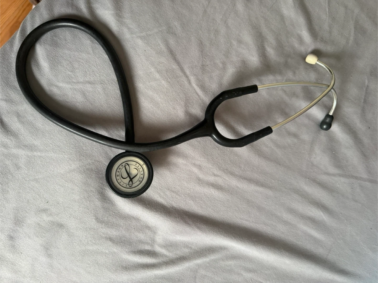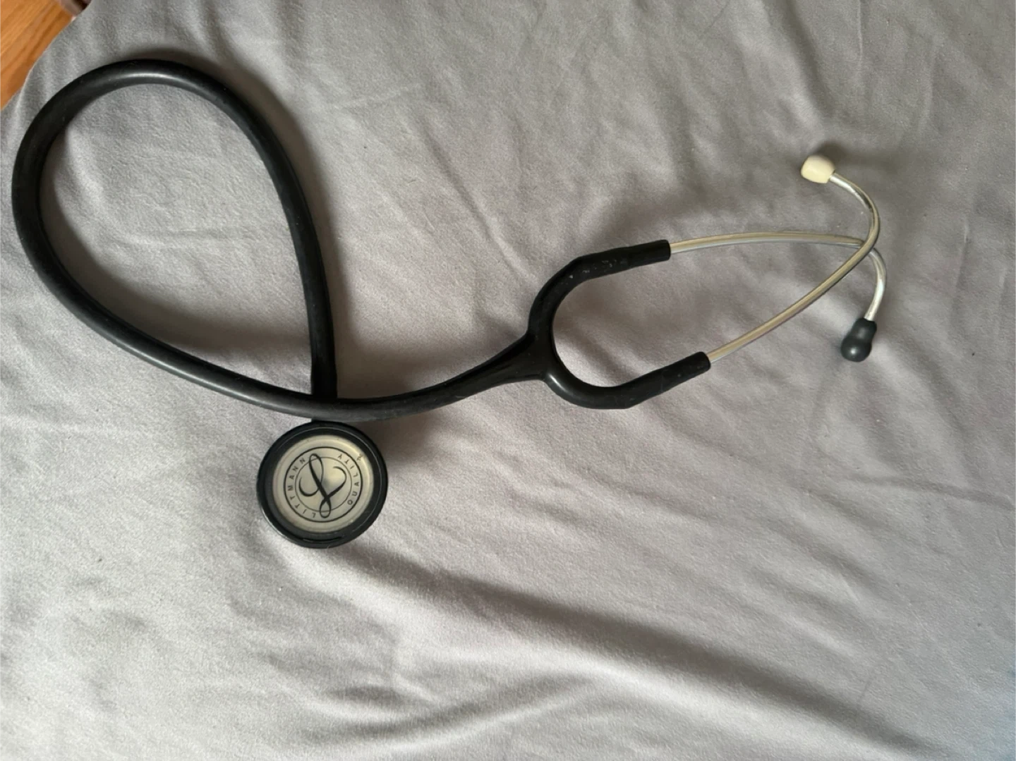 Classic black Littmann stethoscope. It's in good condition and ready for its next owner. This medical tool is essential for healthcare professionals.