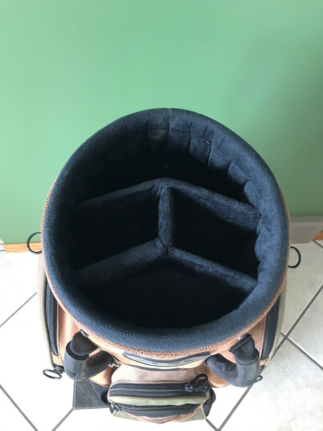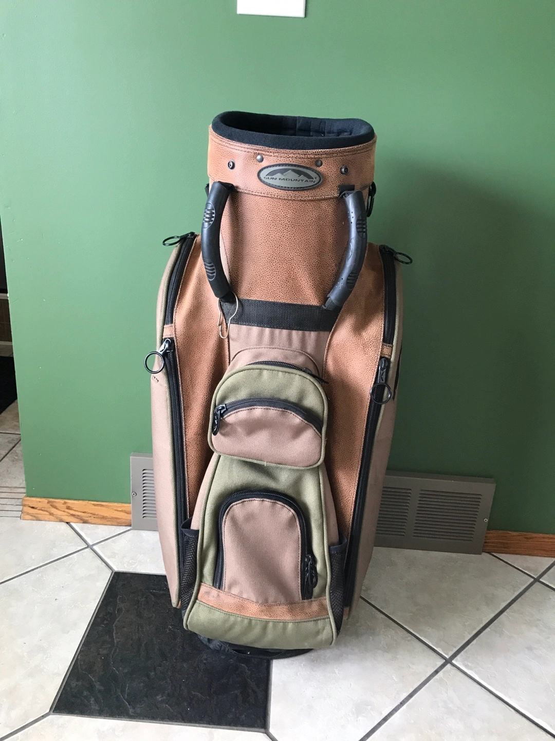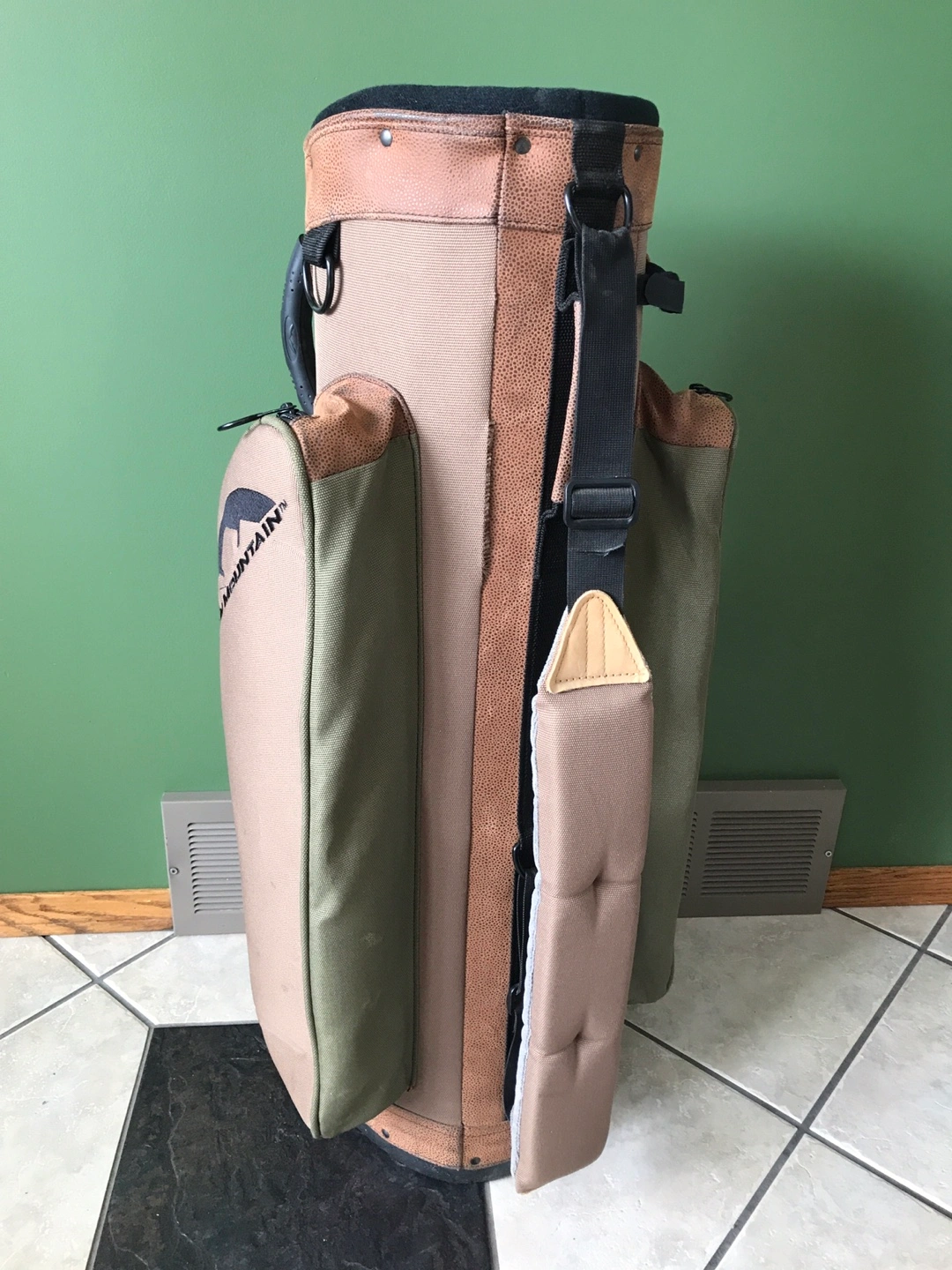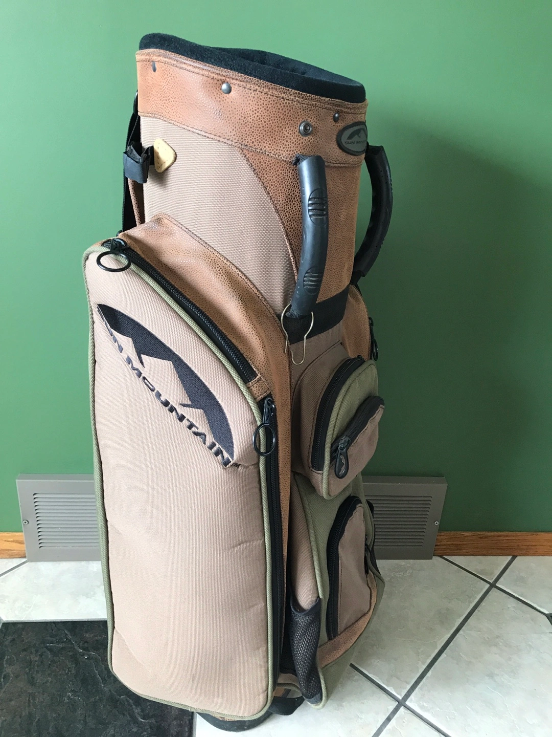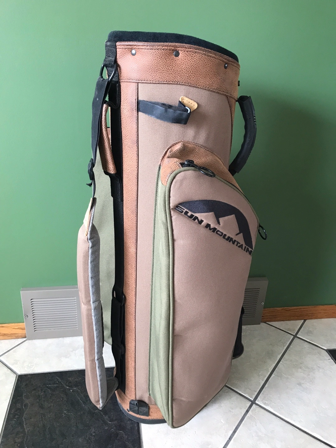 Sun Mountain golf bag in a tan and green colourway. It has multiple pockets for all your gear. Padded shoulder strap included for comfortable carrying. In good condition. $60.00