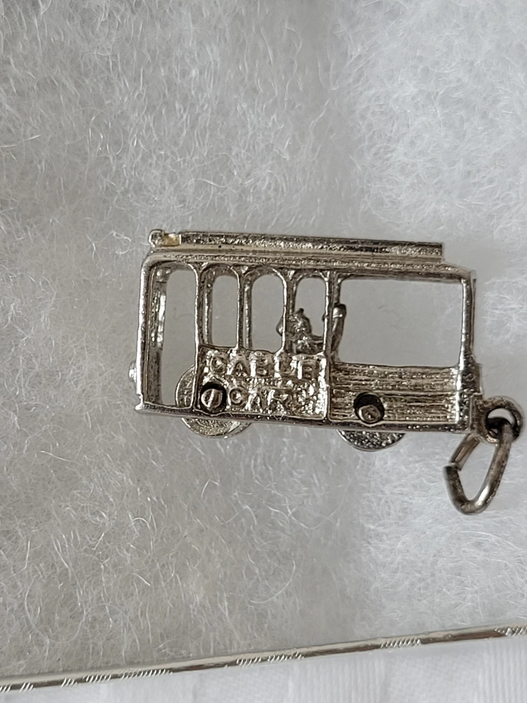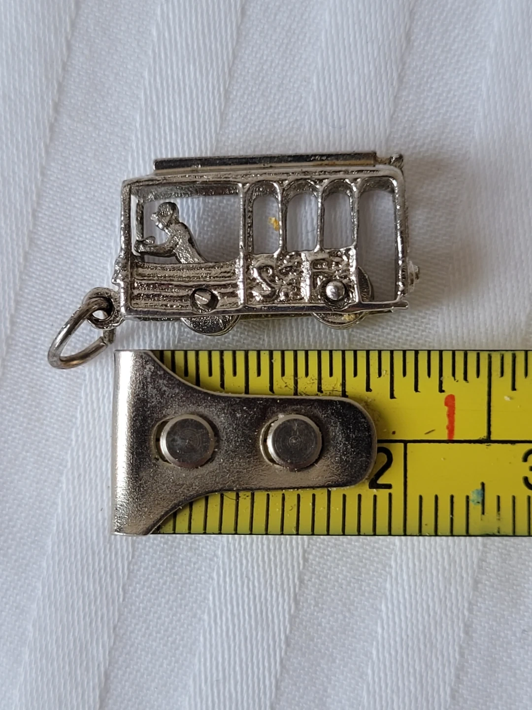 This sterling silver charm shaped like a cable car. It has "CABLE CAR" engraved on the side. The conductor moves back and forth in the car. The charm includes a jump ring for attachment. It measures about 1 inch in length.
