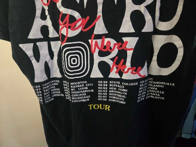 Selling a used Travis Scott Astroworld tour T-shirt with a cool graphic print. It shows some signs of wear but is still in good condition for any fan. Own a piece of music history! Artist: Travis Scott, Tour: Astroworld, Colour: Black, Size: L. Asking $45.00. Still available if you see this ad.