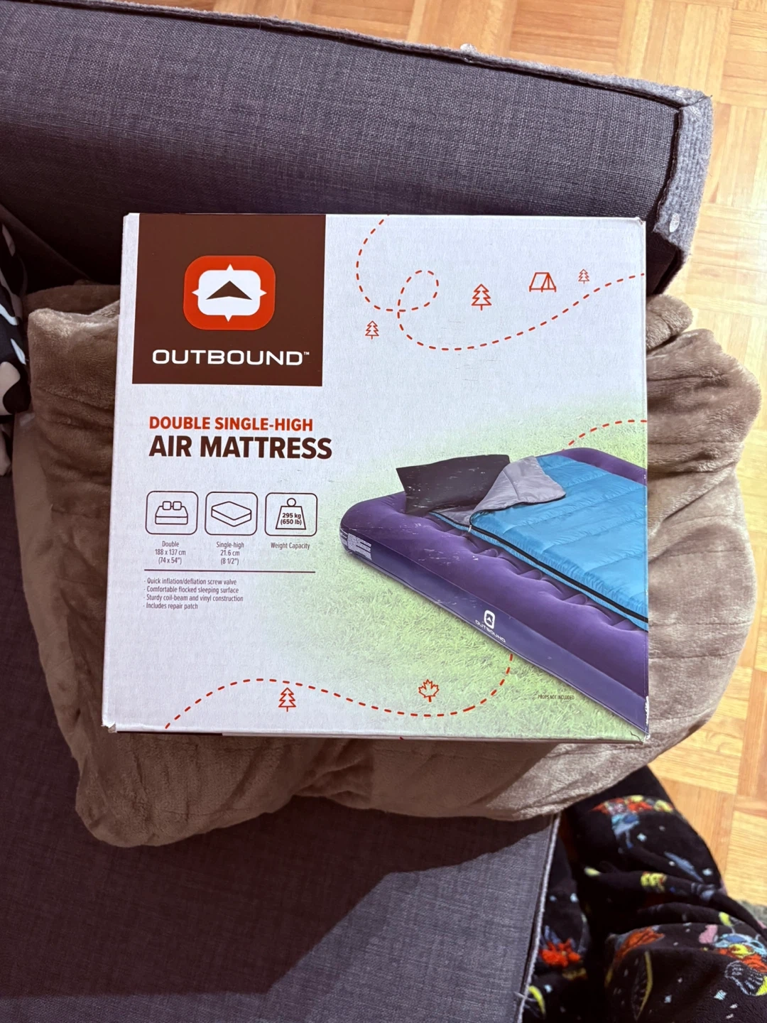 Outbound double air mattress for camping or guests. Includes quick inflation/deflation screw valve and repair patch. It's 188 cm x 137 cm (74" x 54"). Used only once. Can meet at Davisville station.