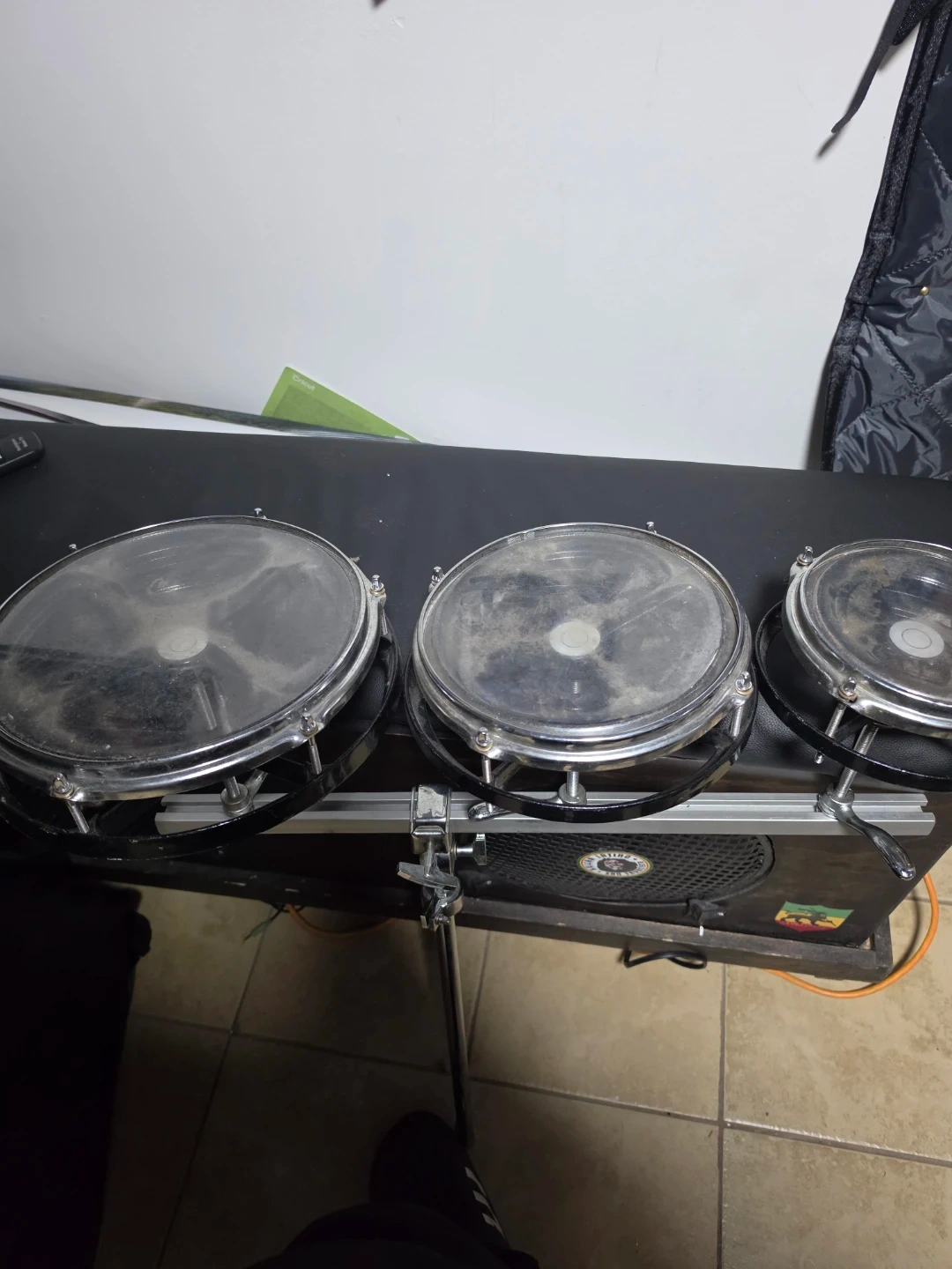 This is a set of three percussion drums. They're mounted on a metal stand. The drums have metal rims and synthetic heads.