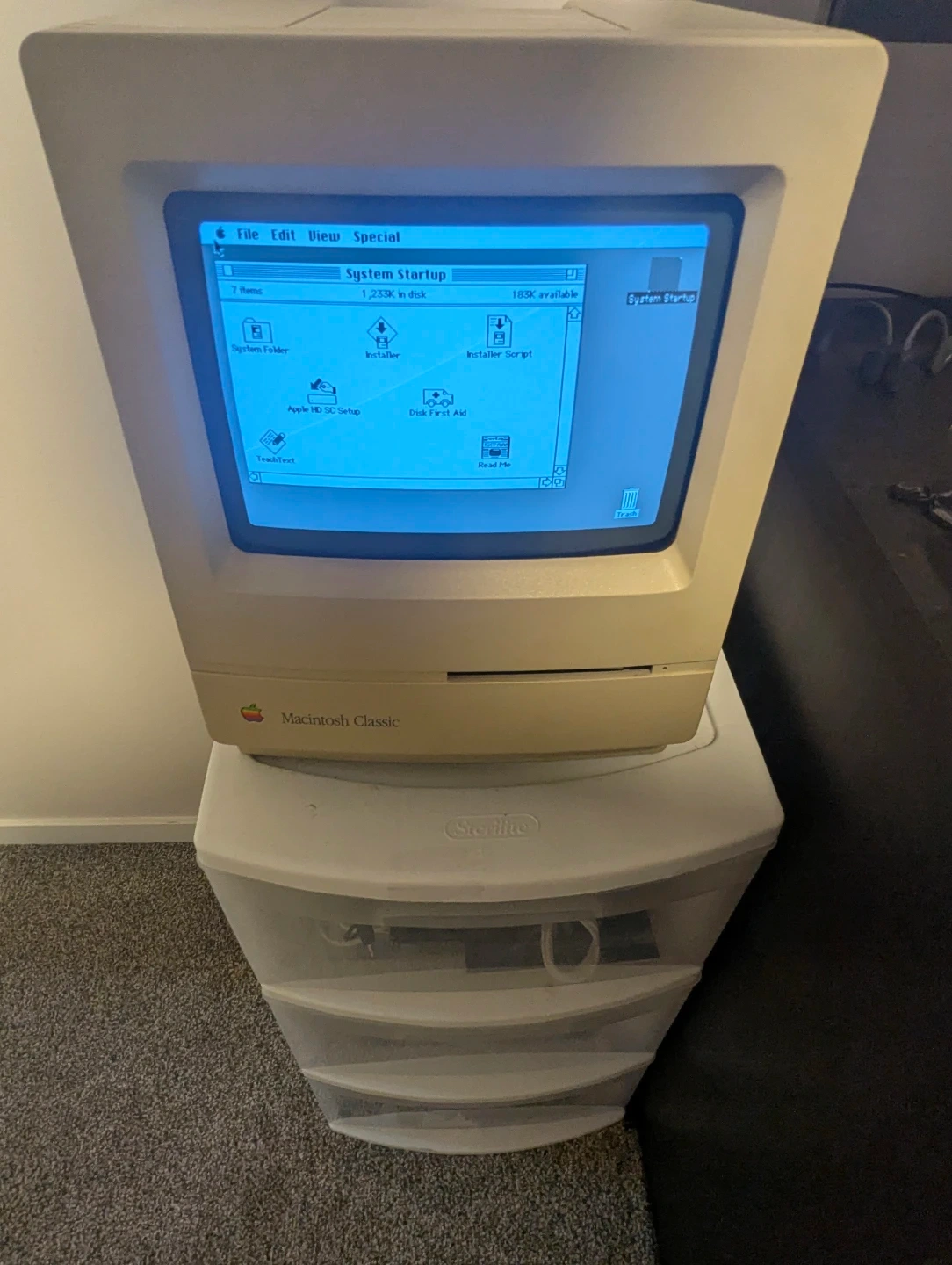 Apple Macintosh Classic all-in-one computer. It boots up to the System Startup screen and "Welcome to Macintosh" dialog. This is a classic piece of computing history!
