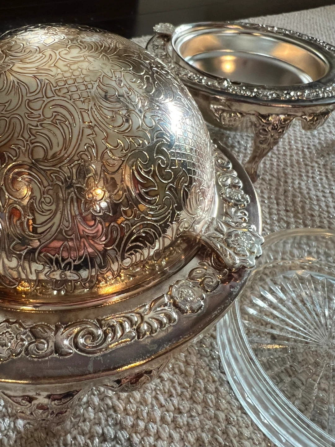 Commonly referred to as a Queen Anne style server, featuring a revolving "hooded" lid with intricate floral engravings