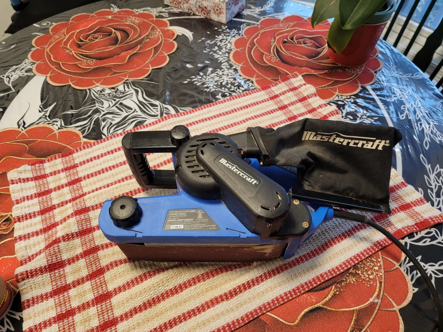 This is a Mastercraft belt sander, perfect for your woodworking projects. It's blue and comes with a dust bag attachment. The sander has adjustable speed settings for different materials. It's a handy tool for smoothing surfaces quickly!