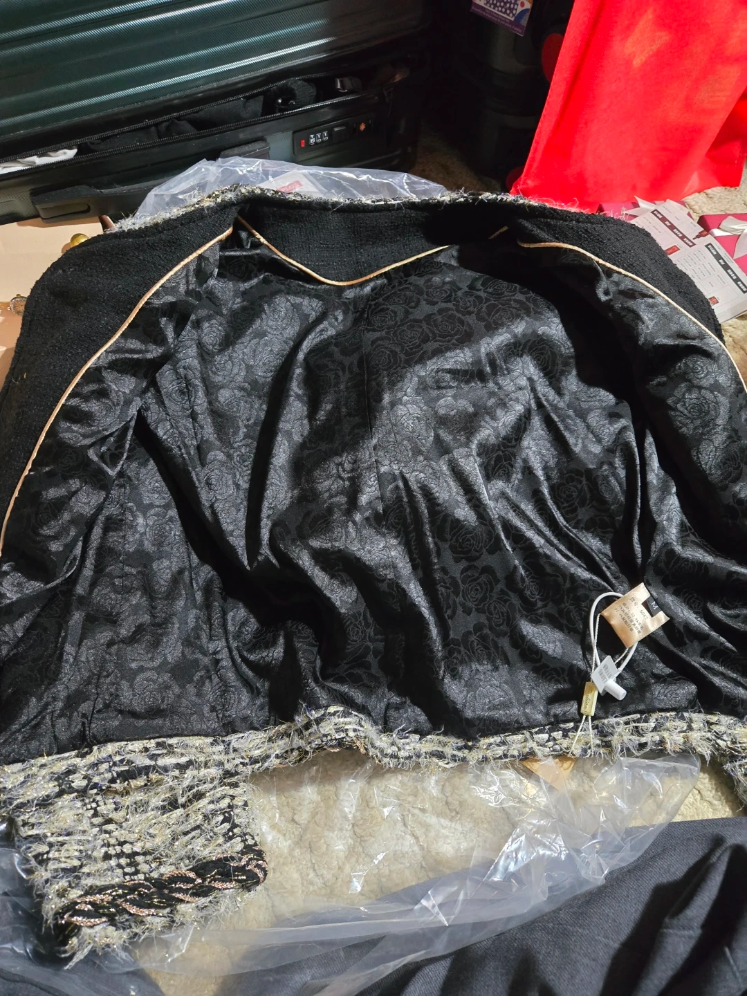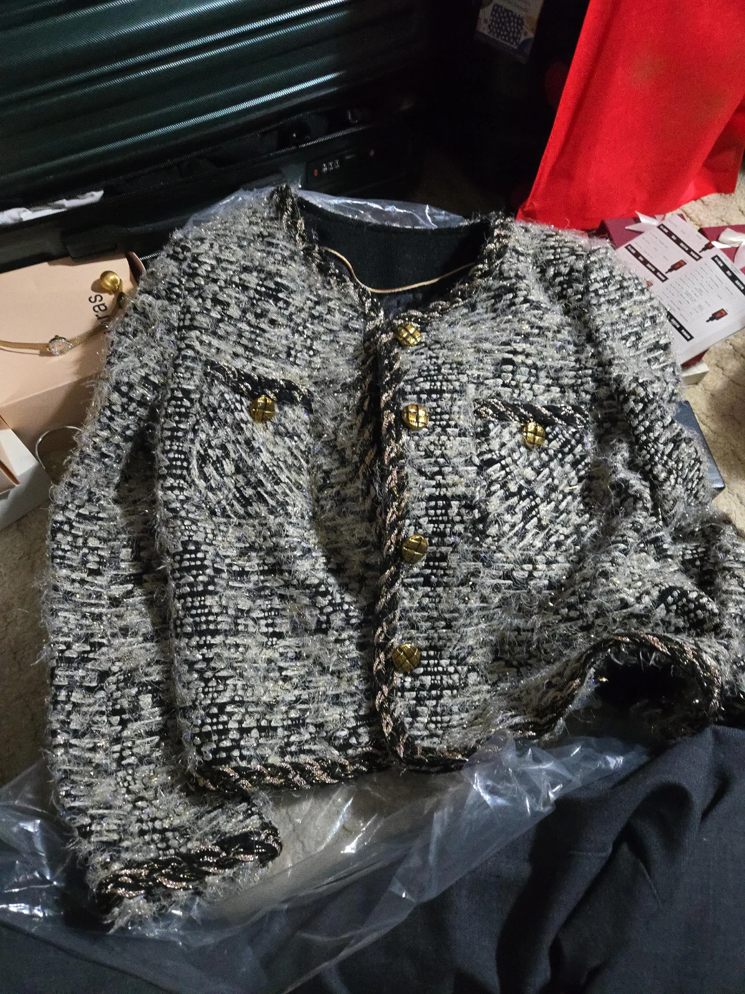 78Here's a stylish tweed jacket from AIBO Vogue Classics! It features a classic design with gold-toned buttons and a detailed lining. Perfect for adding a touch of elegance to any outfit