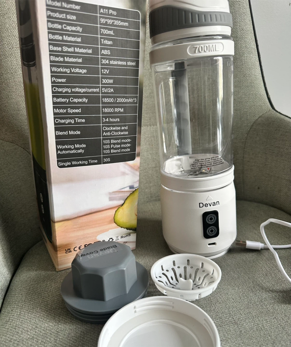 This Devan A11 Pro is an intelligent blender with a 700mL bottle capacity. It's made with a Tritan bottle and ABS base shell material. The blade is 304 stainless steel, and it runs on 12V with 300W power. It includes a USB charging cable.