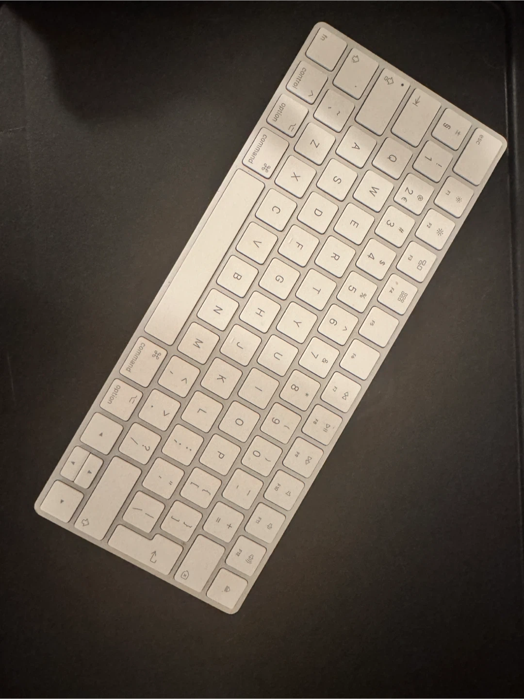 This is an Apple Magic Keyboard. It's a compact and wireless keyboard designed for Mac devices. It's powered by a rechargeable battery and connects via Bluetooth. Great for a clean desk setup!