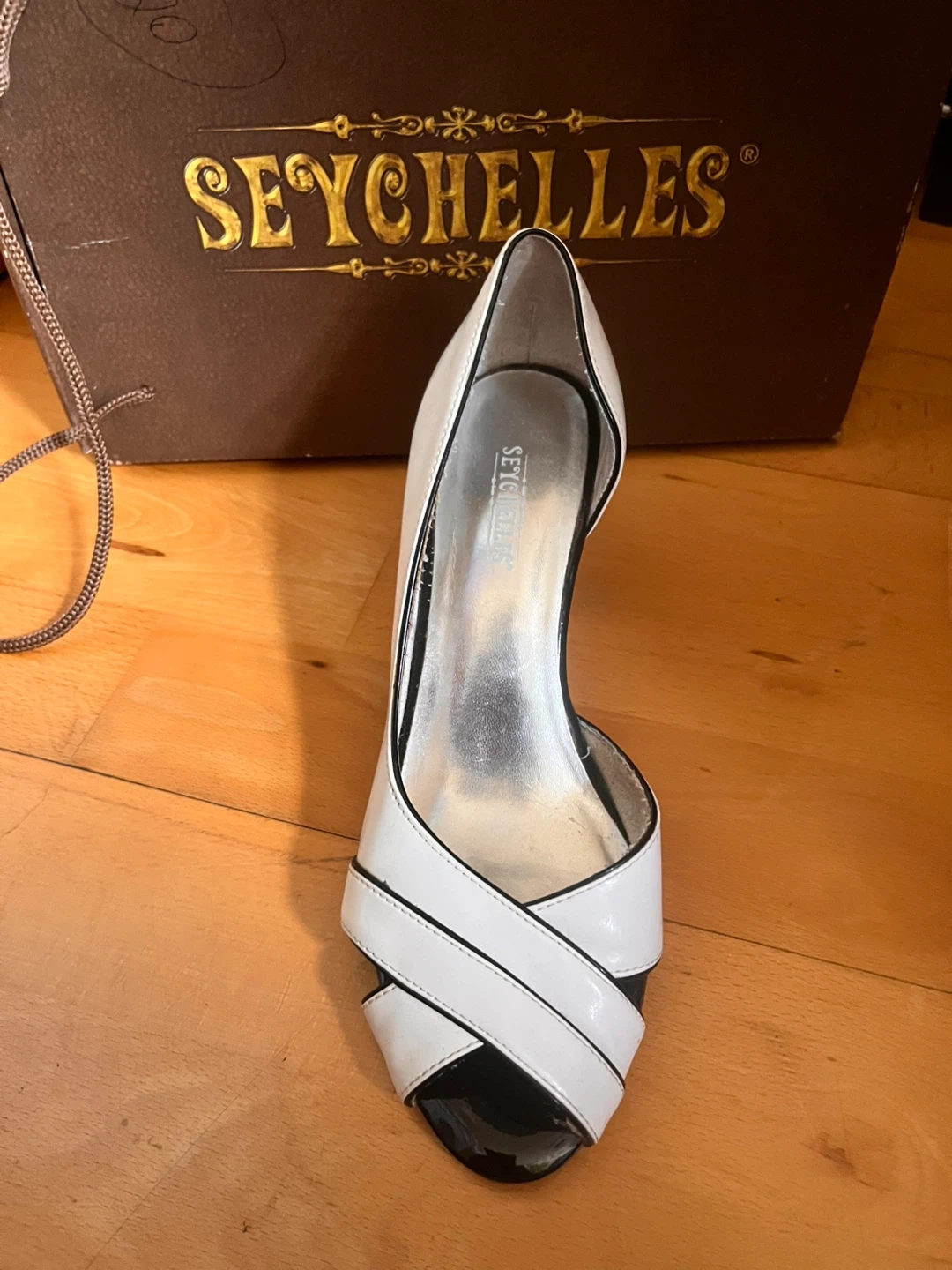 A pair of Seychelles women's heels in white with black accents. Features a peep-toe design and a low heel. Includes original box.