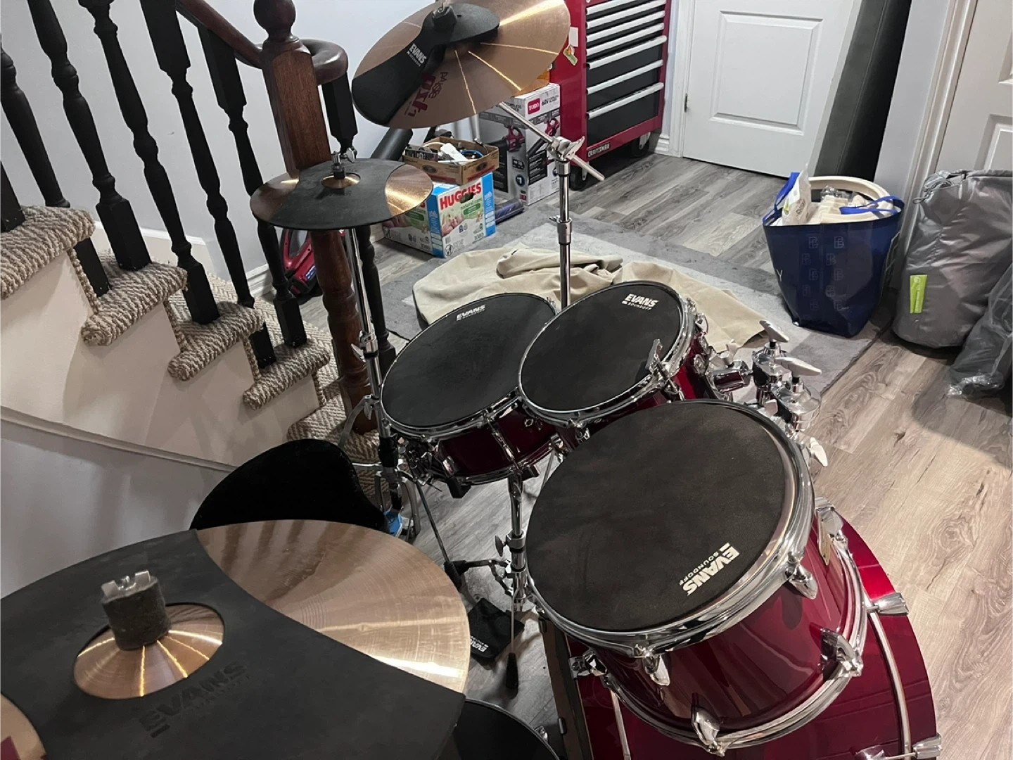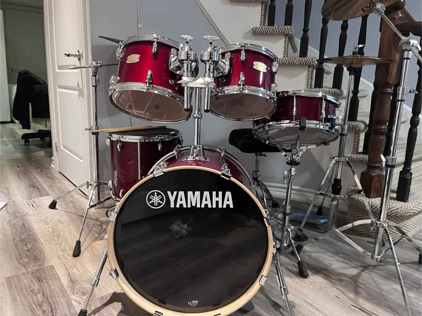 Full Yamaha drum kit in a deep red finish. Includes bass drum, snare, tom-toms, and cymbals. Evans drum heads are fitted. Perfect for drummers looking for a reliable and great-sounding setup. Some minor scuffs on cymbals.