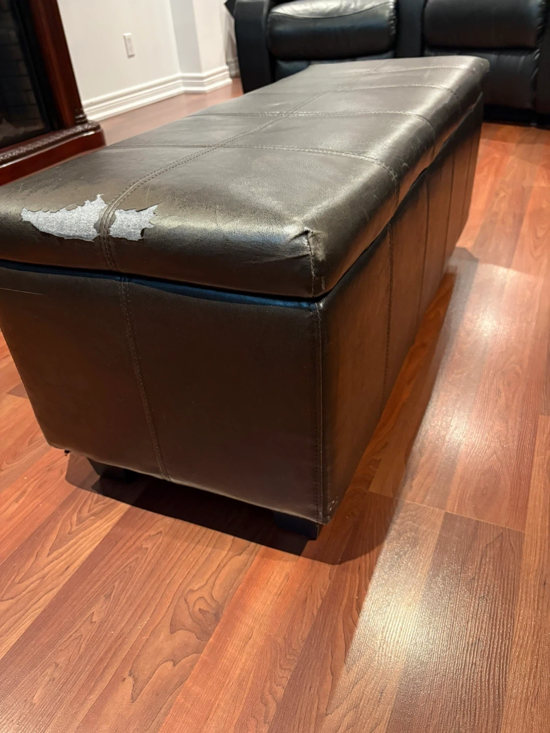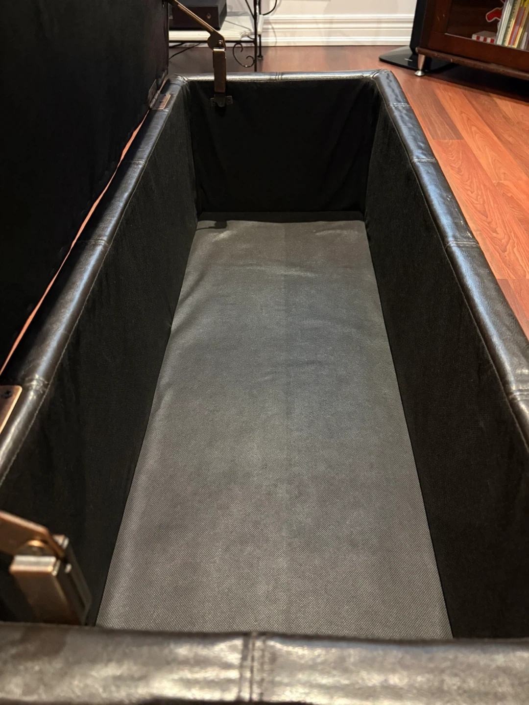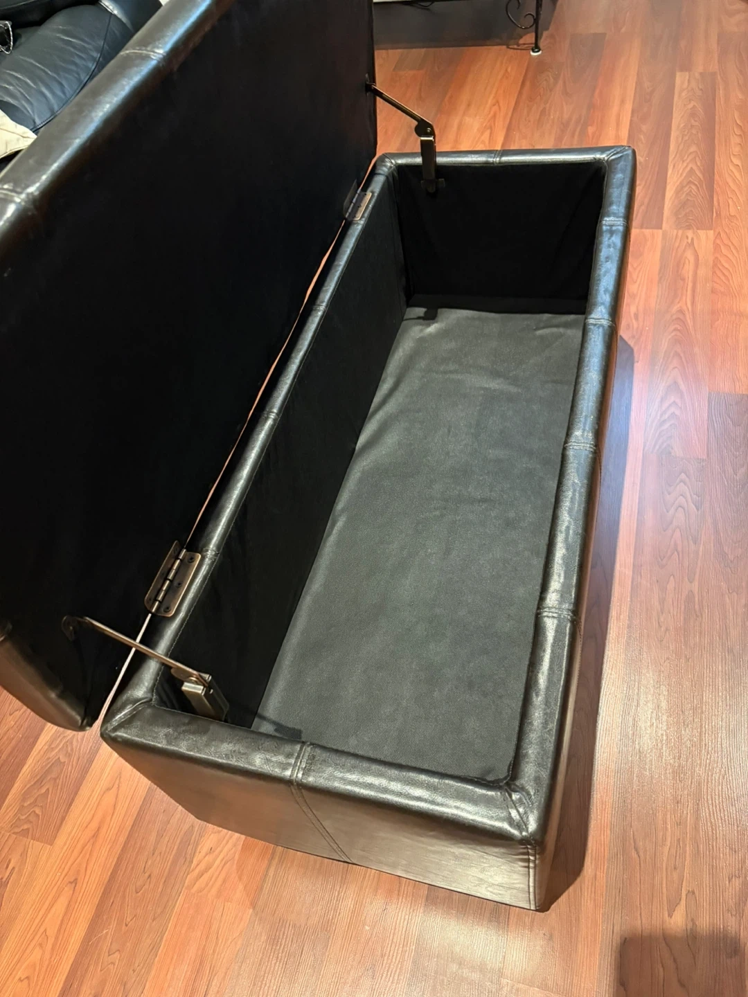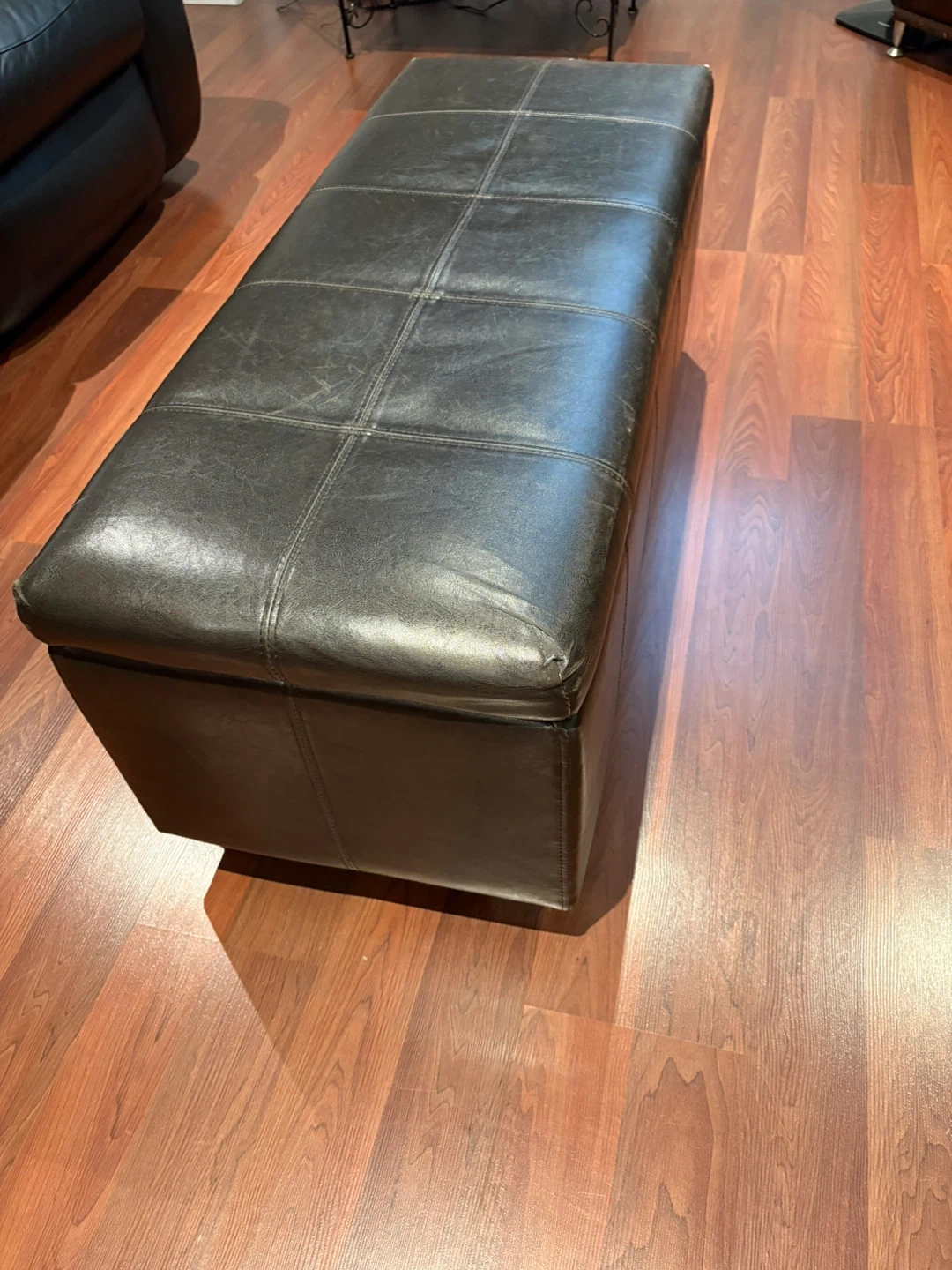 Used Faux leather storage ottoman bench with hinged top. Interior is lined. Some wear on the top surface. Great for extra seating and hidden storage!