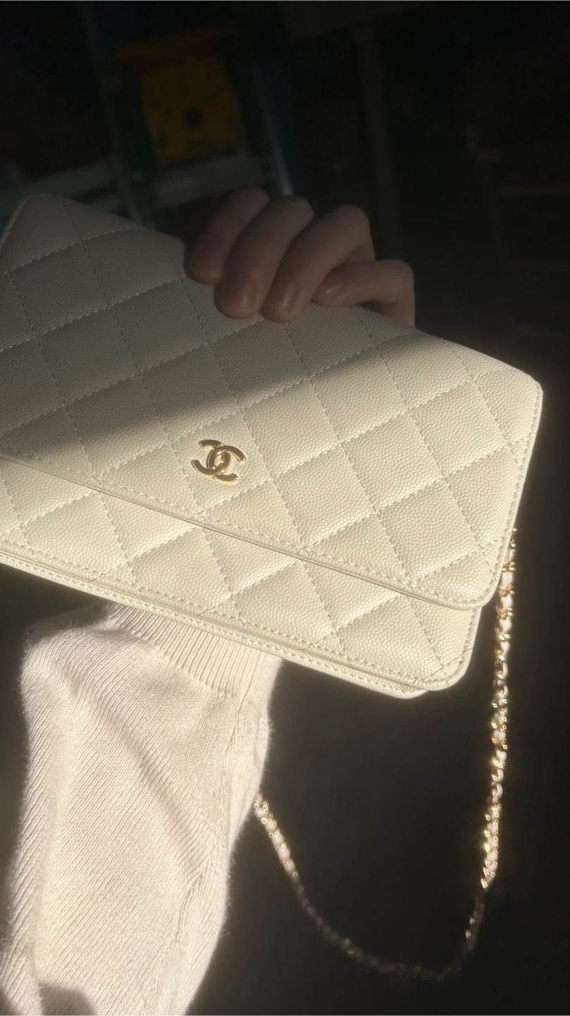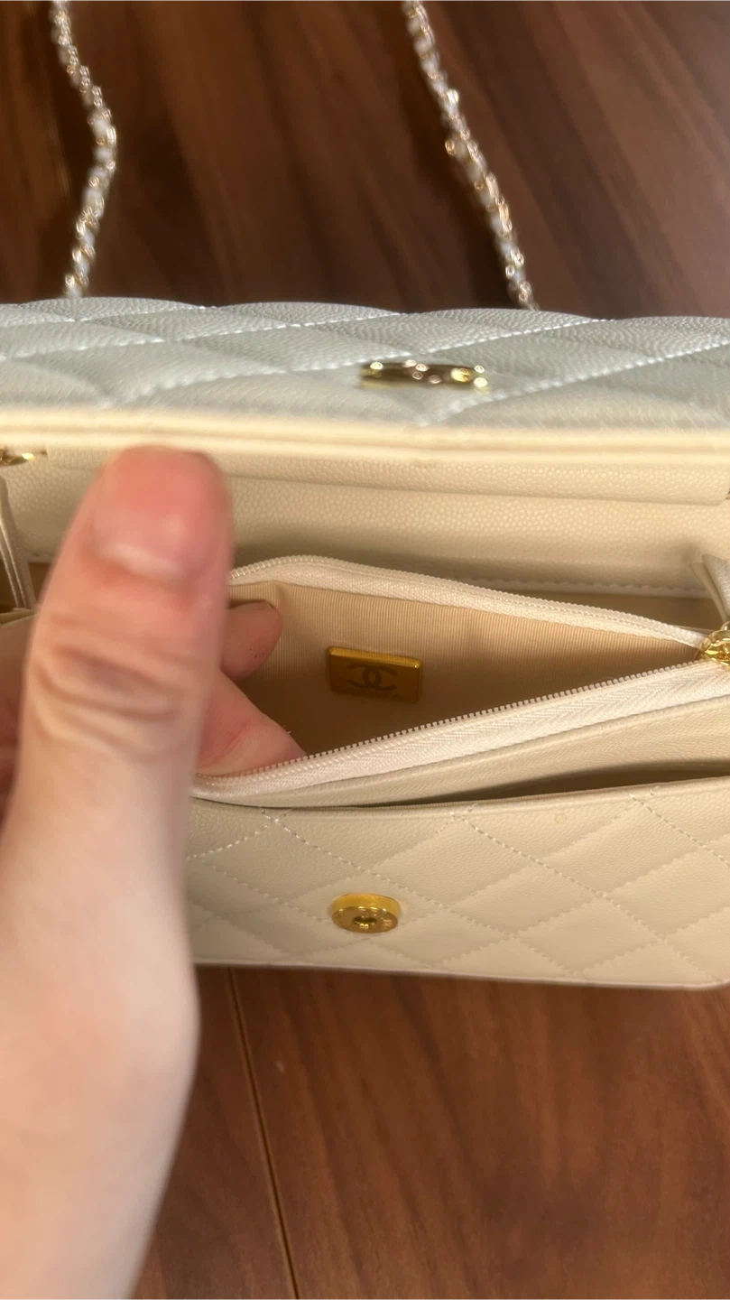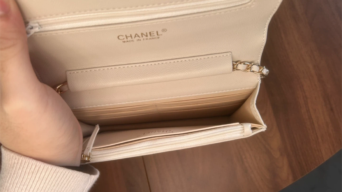 This is a Chanel wallet on chain bag. It's made of caviar leather and features a gold-tone chain strap. The interior has multiple card slots and a zippered compartment.