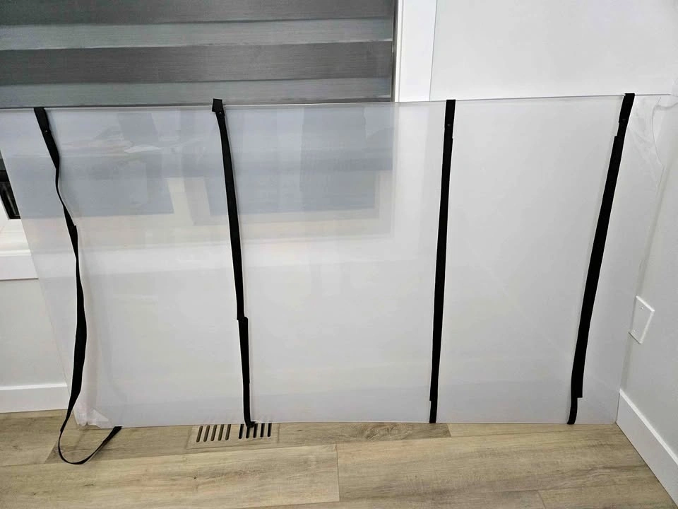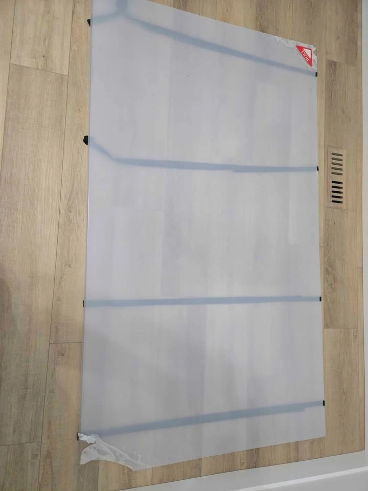 This is a 75-inch TV guard protector. A piece on one corner came off during delivery, but the rest of the structure is intact. It could potentially be used for a smaller TV guard if someone can repurpose it.