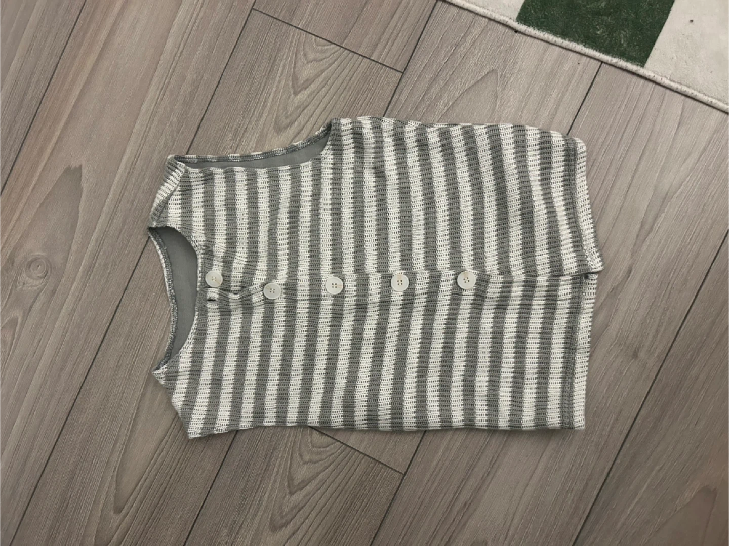 A grey and white striped sleeveless vest with four white buttons. Material appears to be a knitted fabric. It's a light layer for warmer days. Someone might wear this for a casual look. Size small. Never worn.