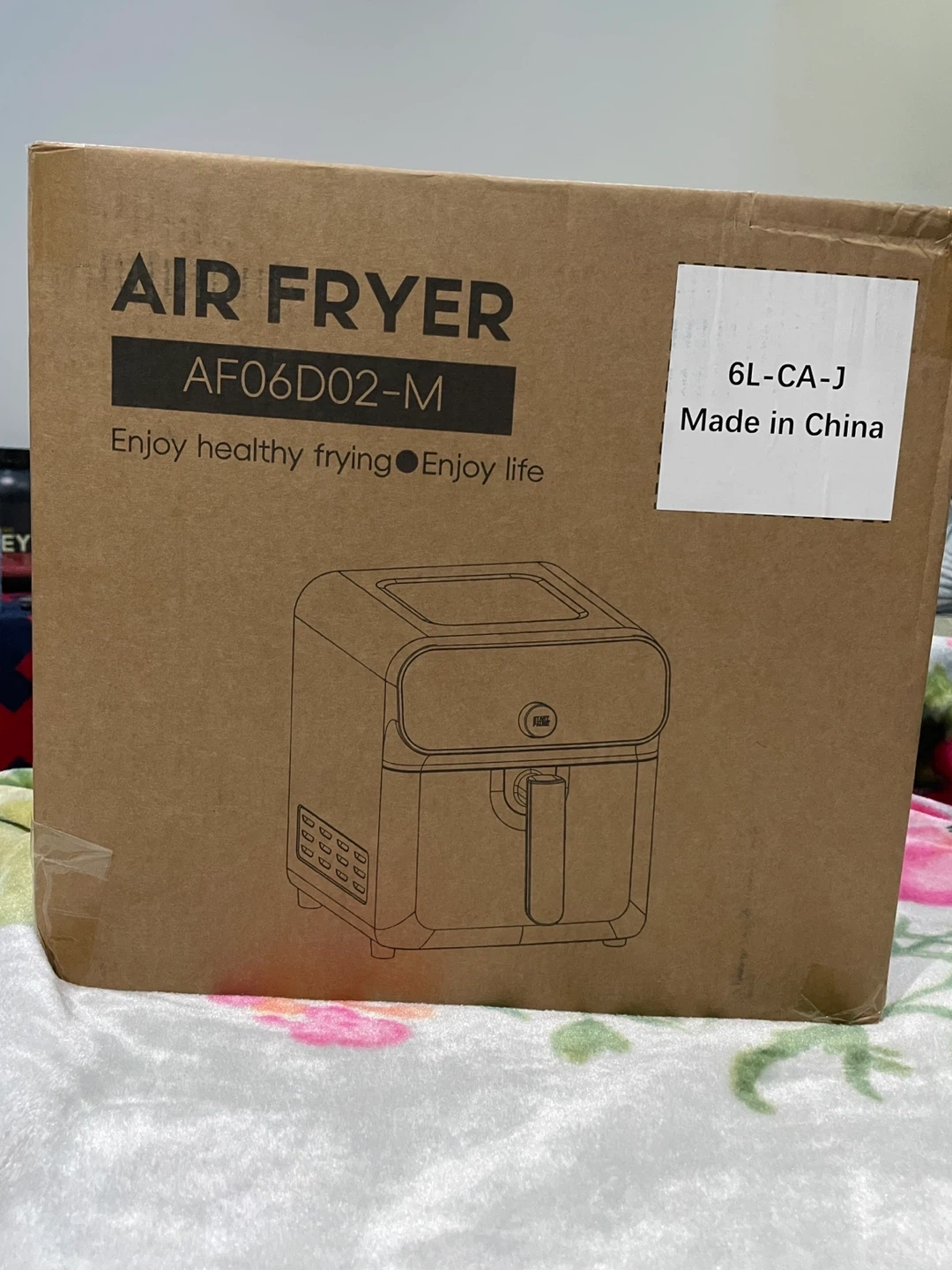 Selling an air fryer, model AF06D02-M. It's a 6L-CA-J size. Enjoy healthy frying and a healthy life with this appliance! It helps you cook with 85% less oil. It also features a cool touch screen program and a stainless steel body basket and pot. Enjoy fast frying food. The box is included