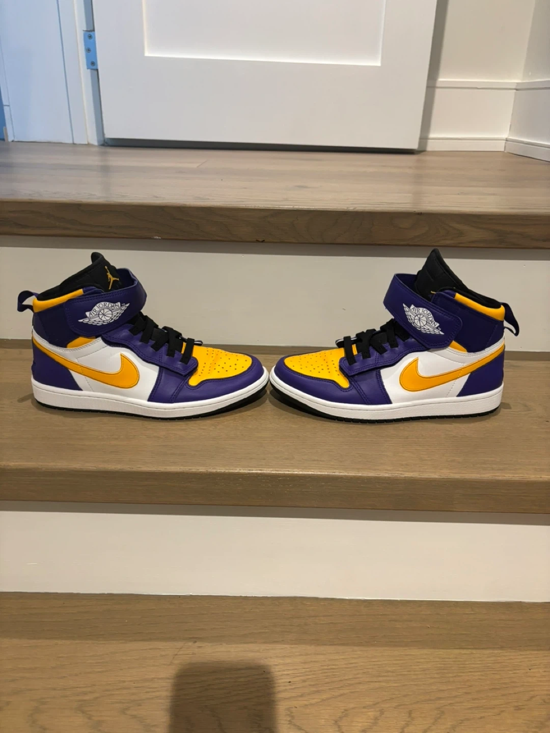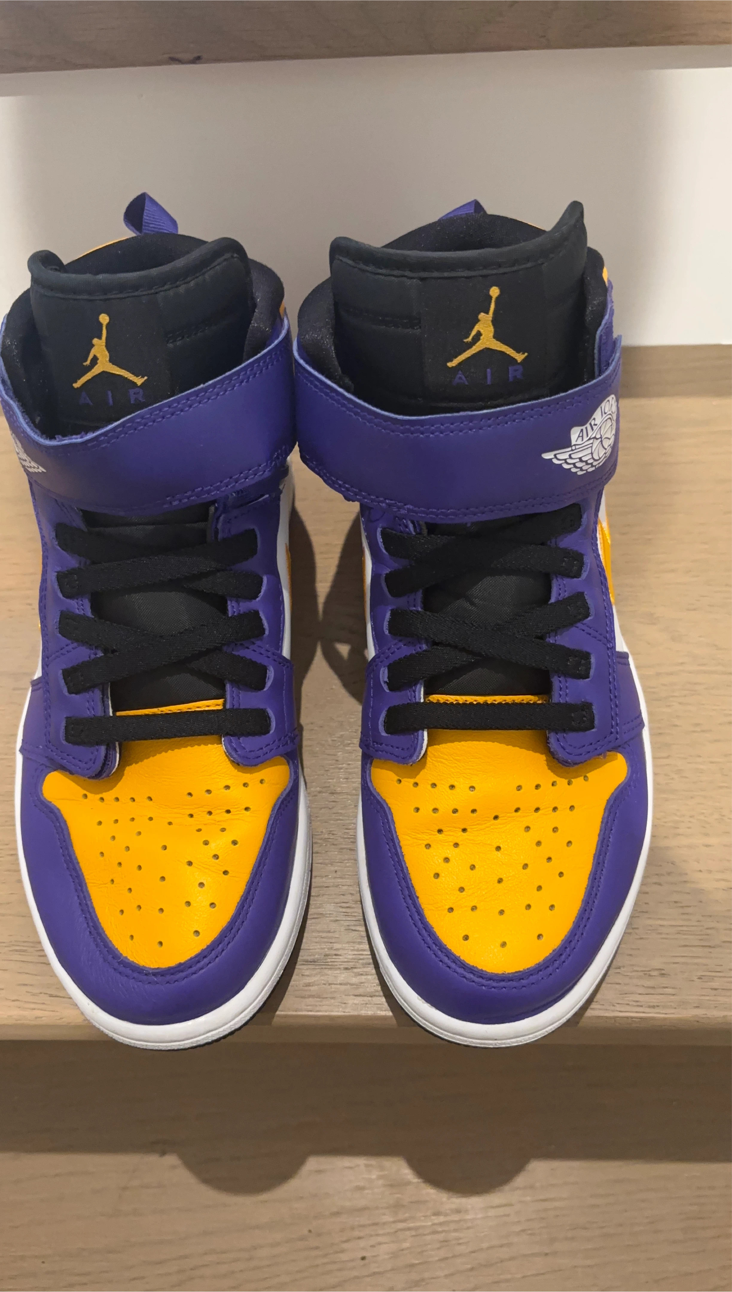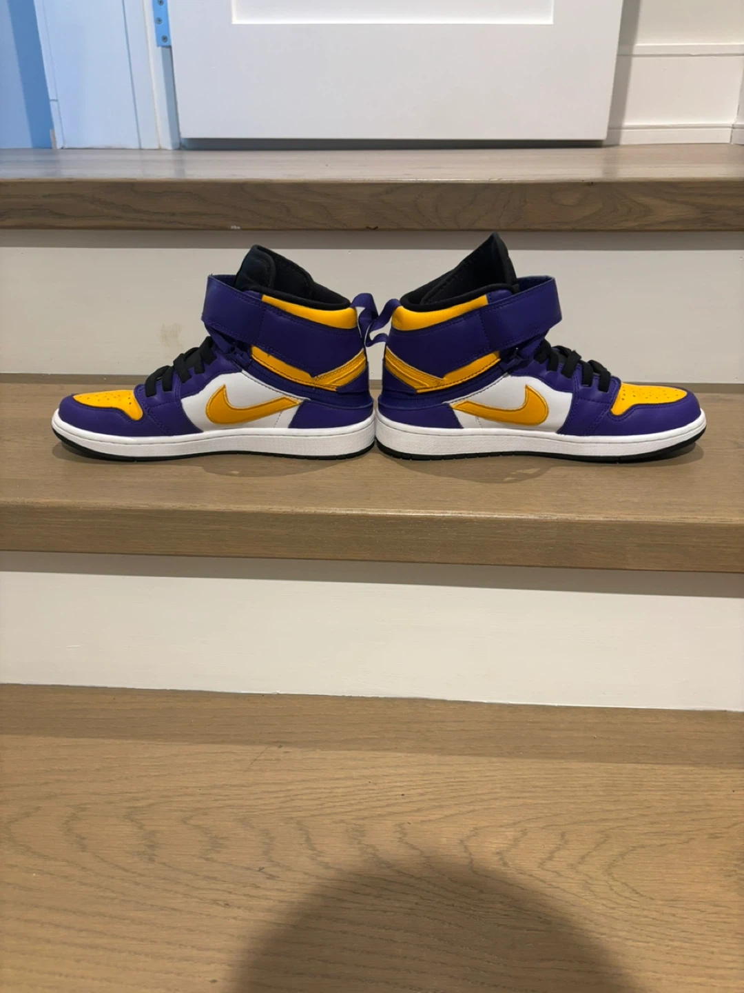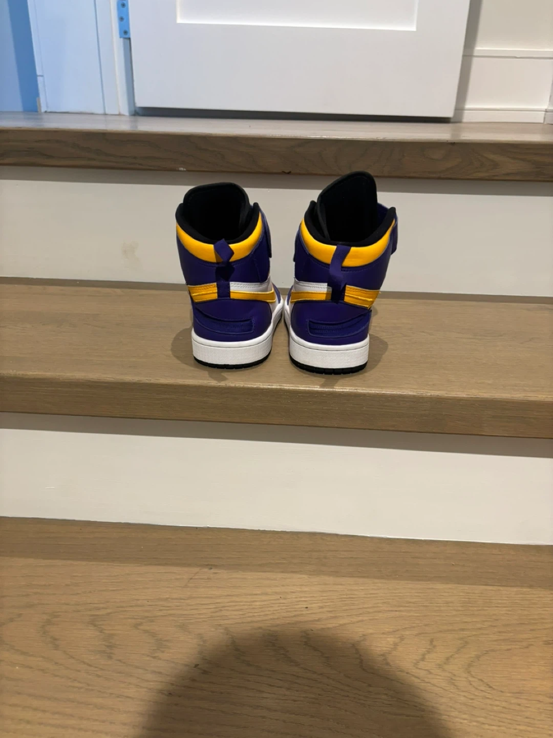 Selling a pair of Air Jordan 1 High Strap shoes in the Lakers colourway! They're in great shape. The colours are vibrant with purple, yellow, and white accents. Size 6