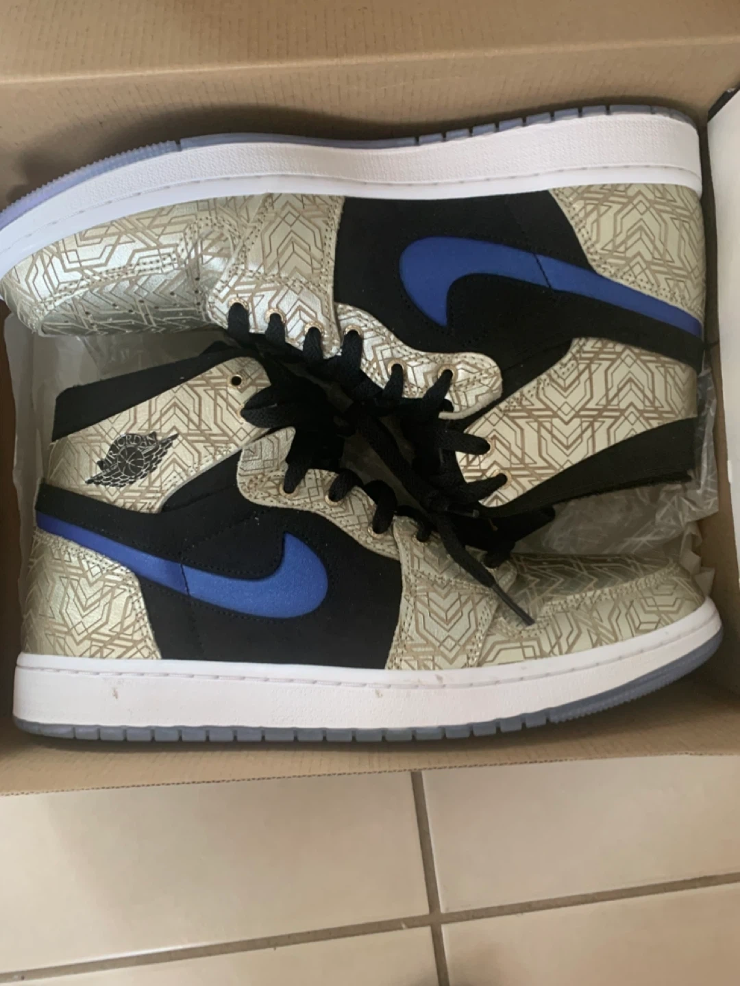 Selling a pair of Air Jordan 1 High Zoom CMFT 2 sneakers! They feature a stylish black and blue colourway with a unique pattern. The shoes are in good condition and come in the original box