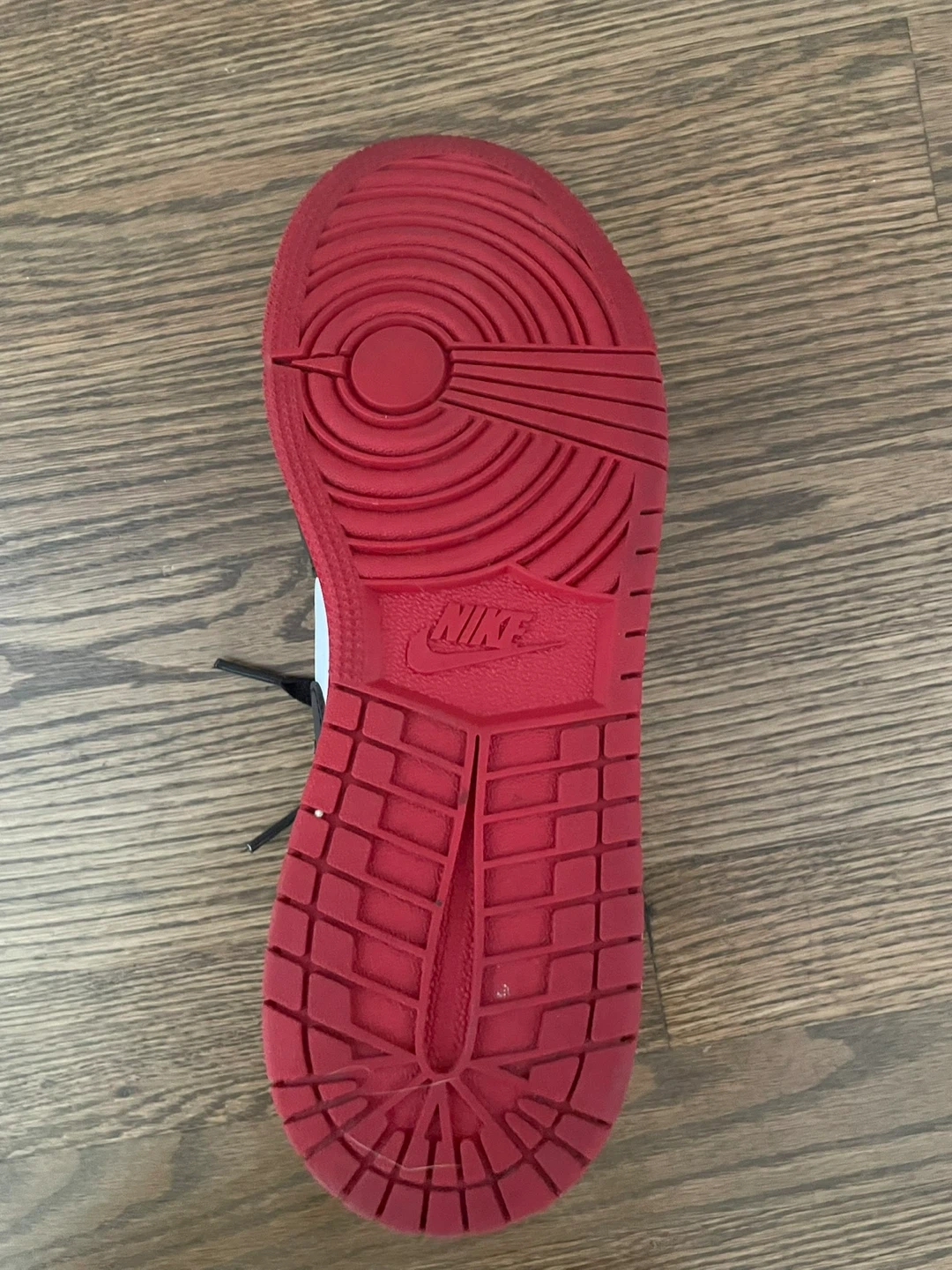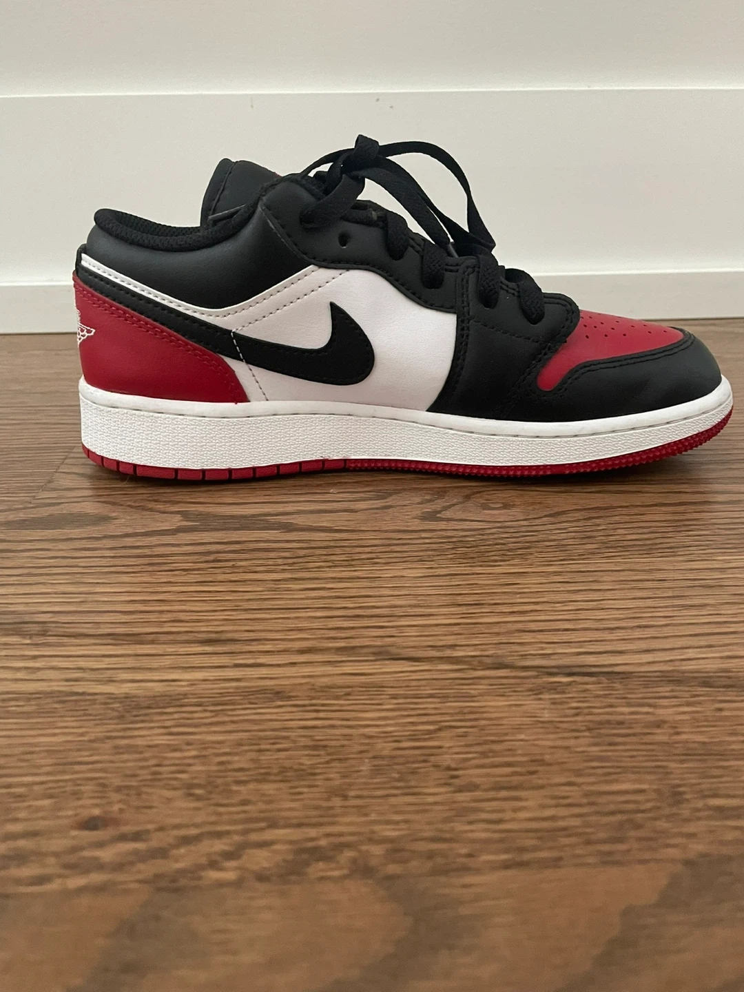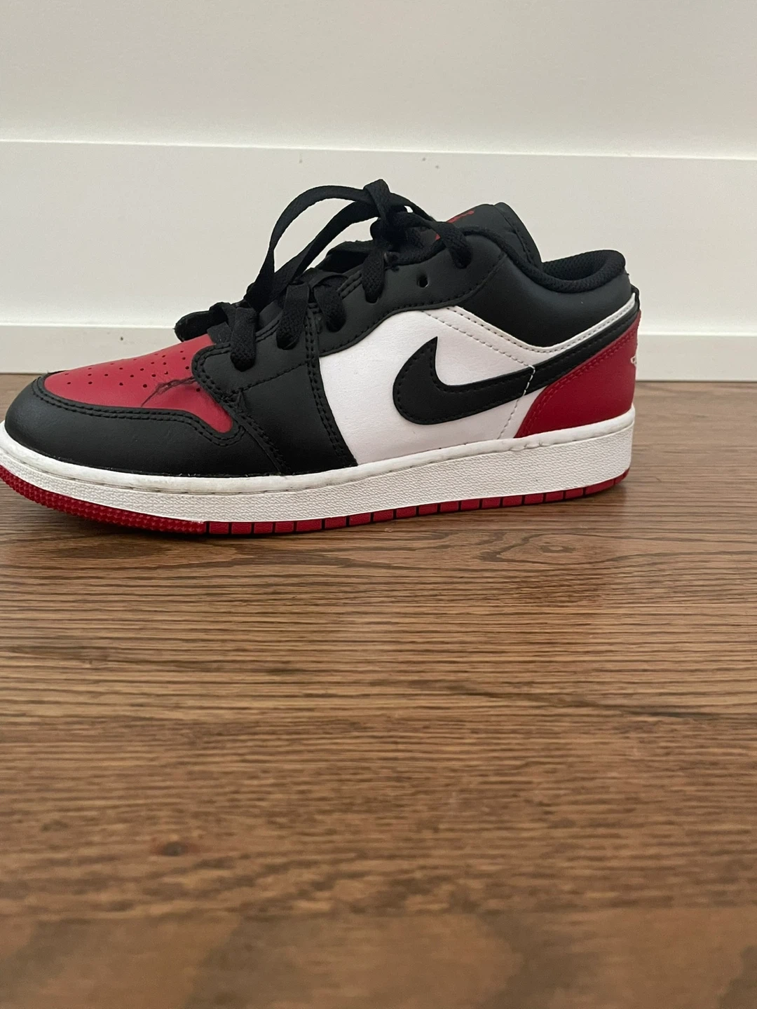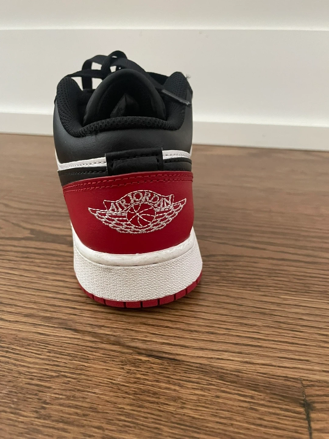 Selling a pair of Air Jordan 1 Low sneakers in a classic black, red, and white colorway. These are in good condition and ready for a new home!