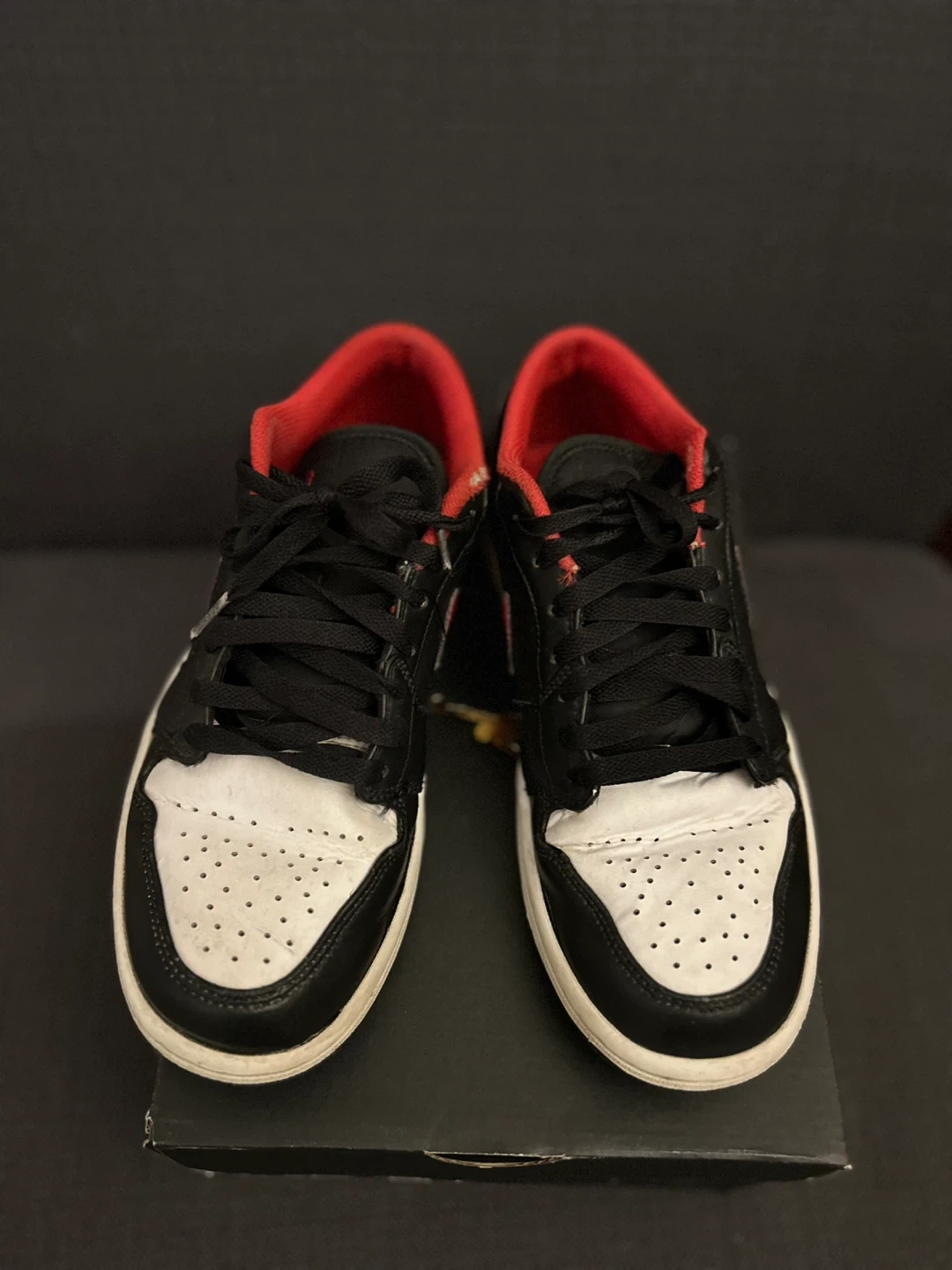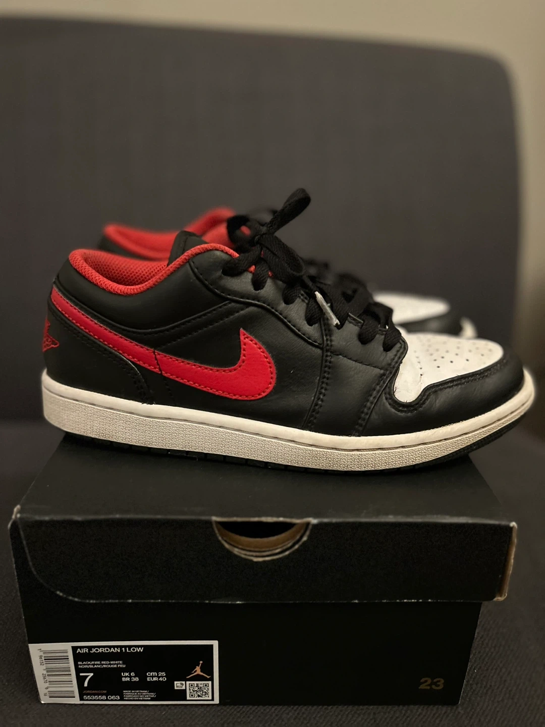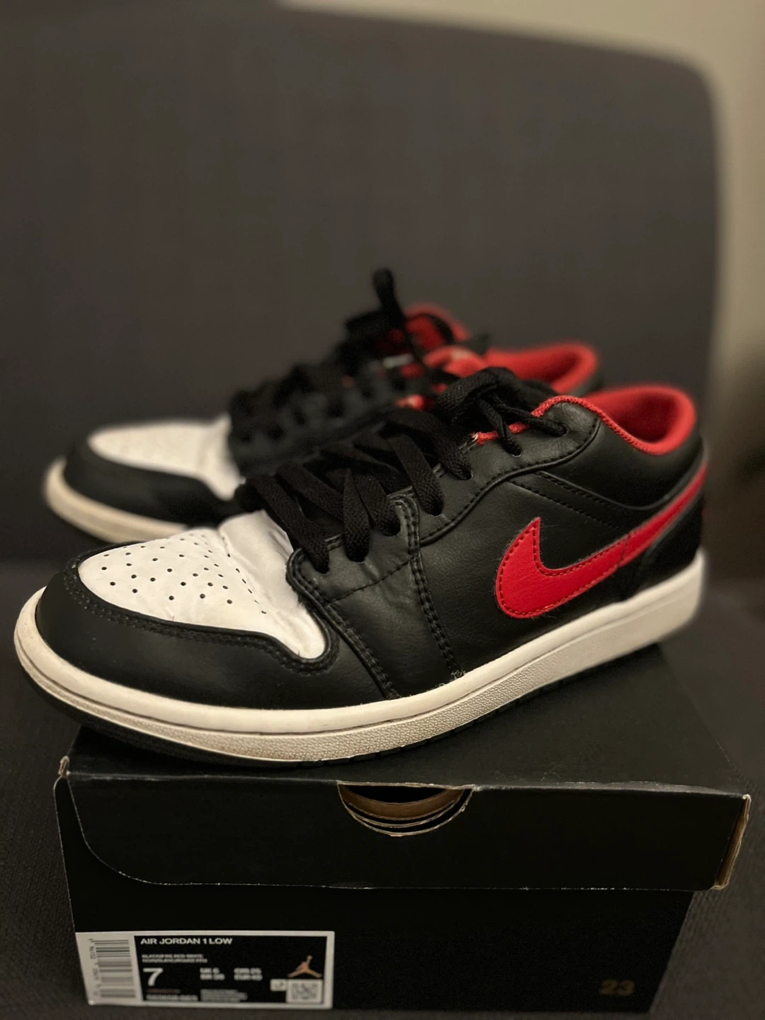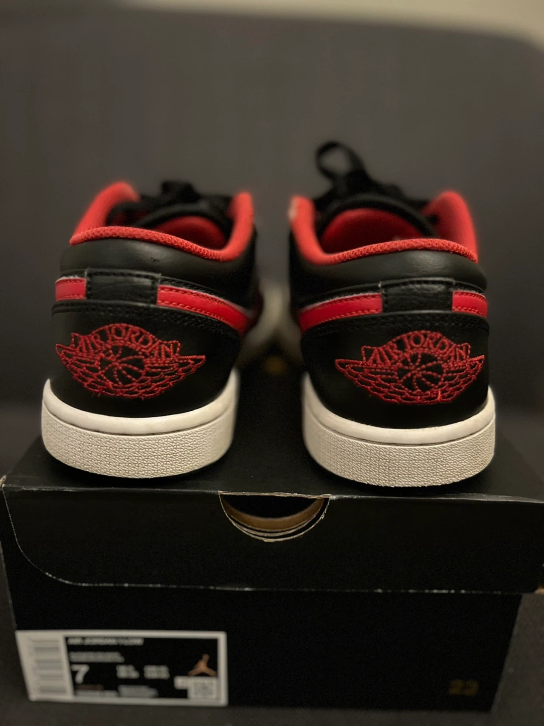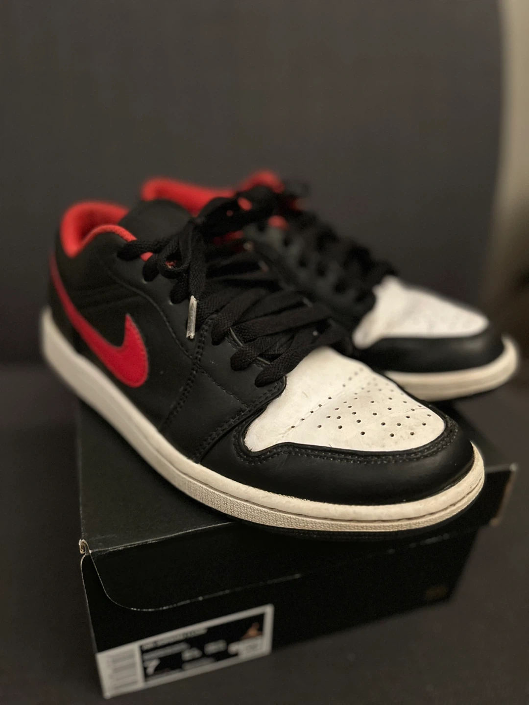 Selling a pair of Air Jordan 1 Lows in black, red, and white. They are a size 7 and come with the original box.