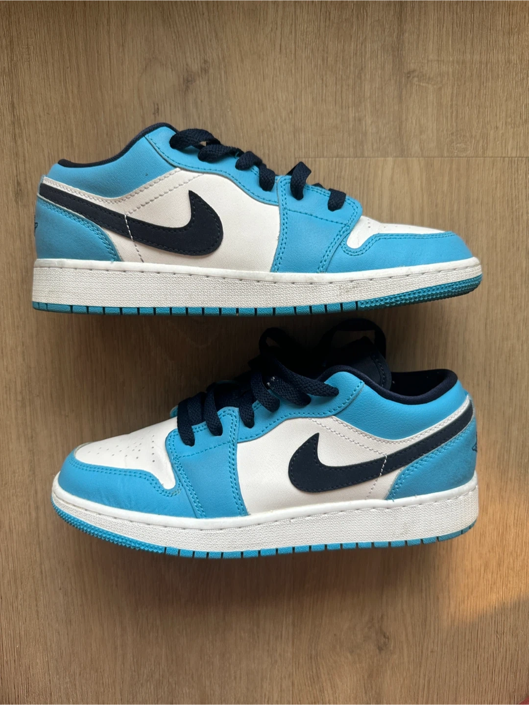 10Selling a pair of Air Jordan 1 Low (GS) sneakers in size 5.5Y. The colour is white / blue. They are in great condition and ready for a new home!