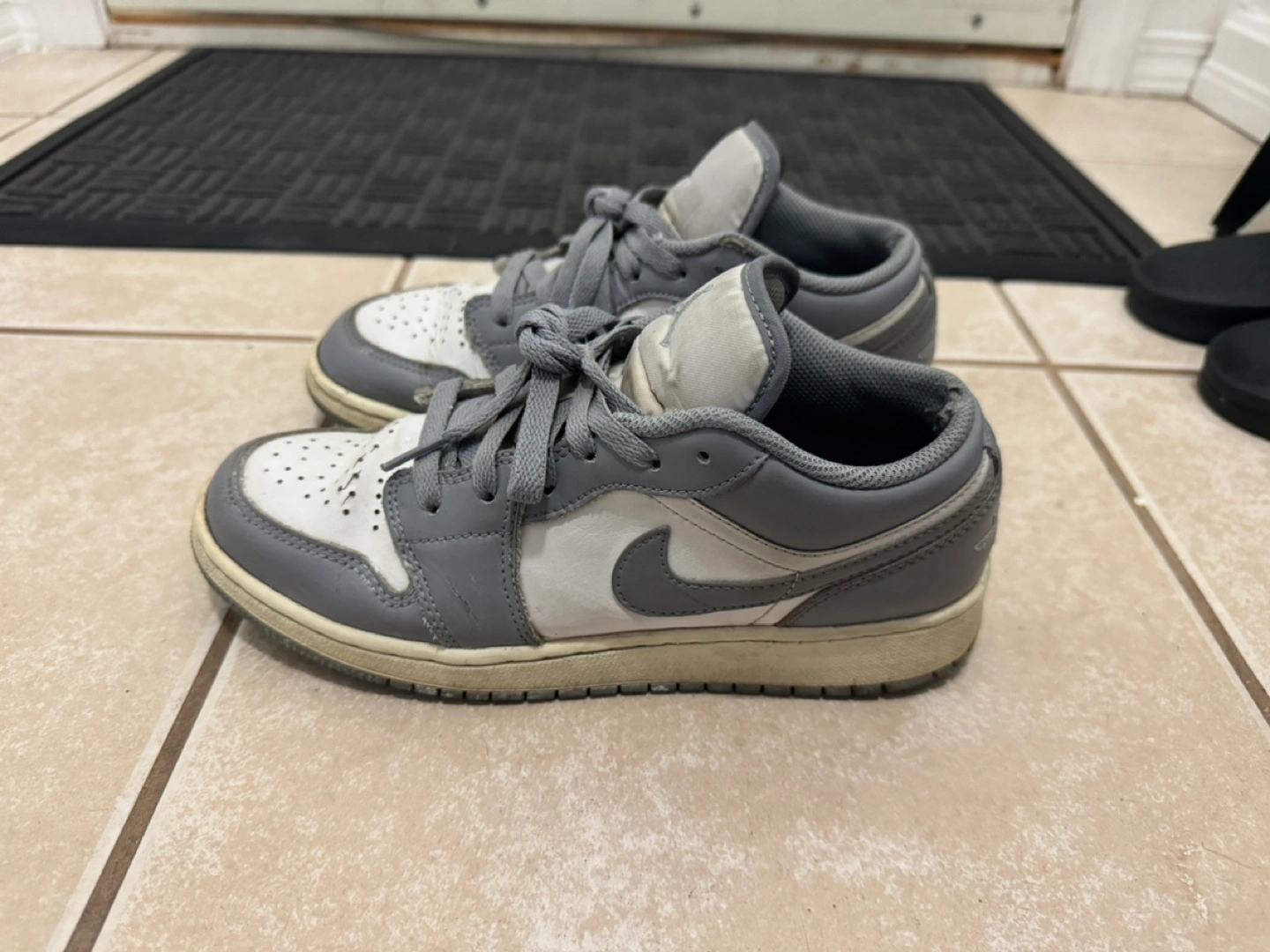 16Selling a pair of Air Jordan 1 low sneakers in grey. Bought is StockX. Verified. Size: men’s 5.5, women’s 7