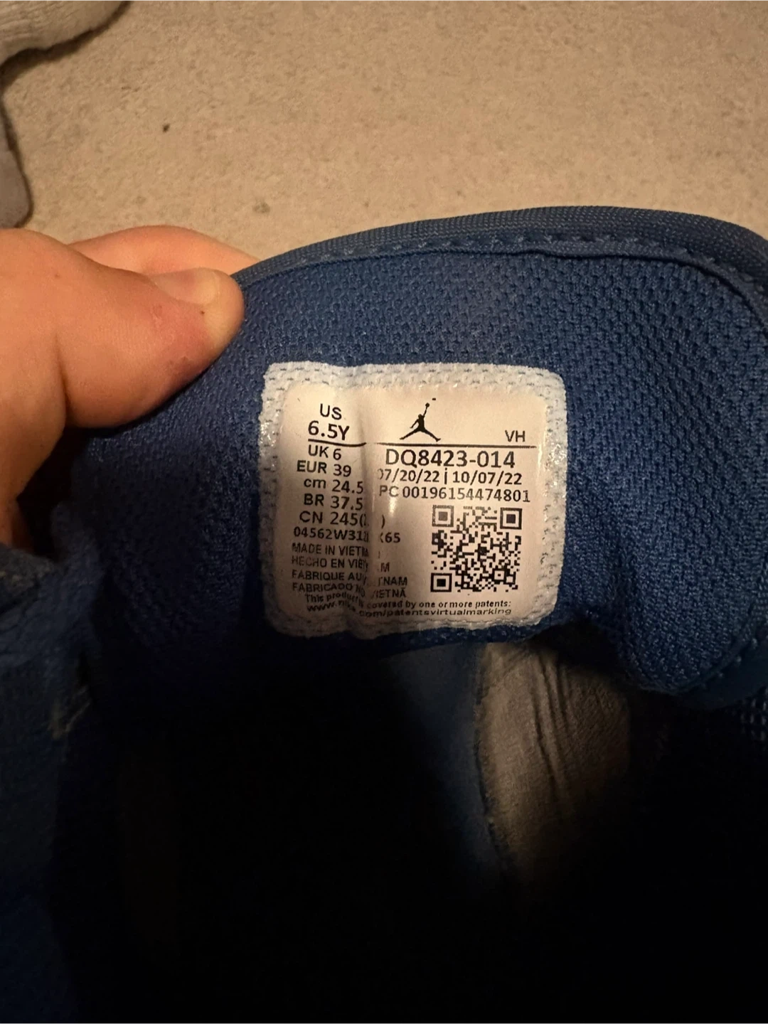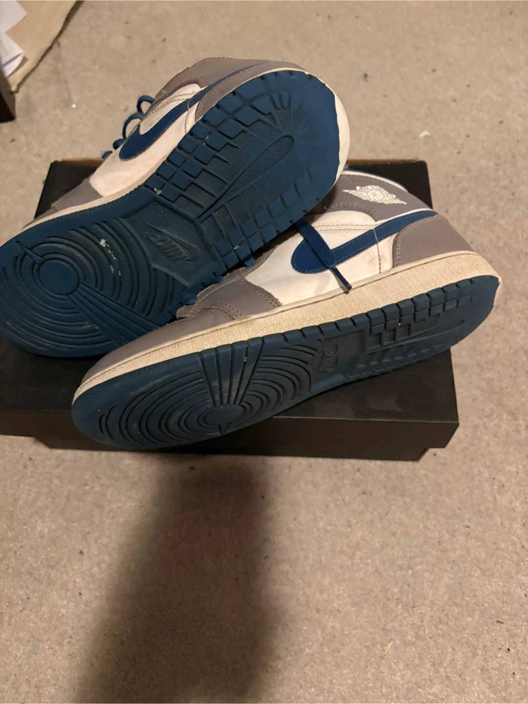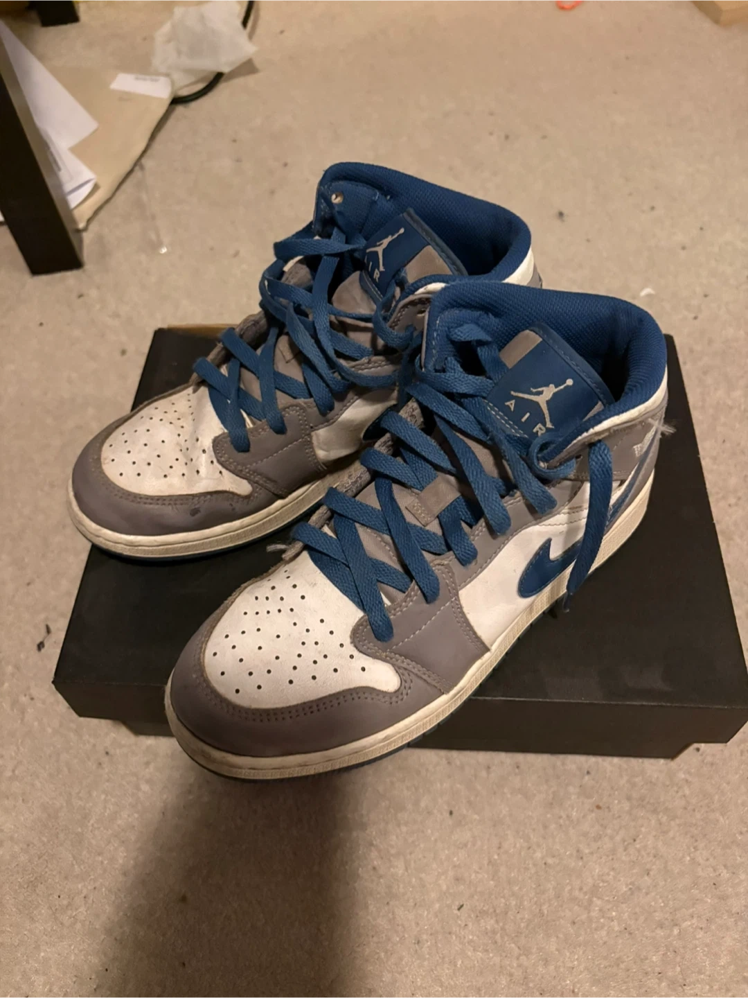 10Selling a pair of Air Jordan 1 Mid sneakers in blue and grey. They're in used condition and ready for a new home! Size is 6.5 in youth.