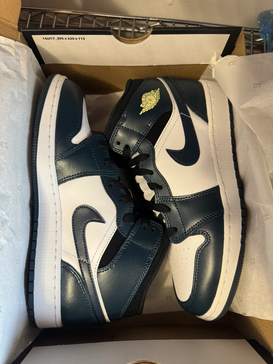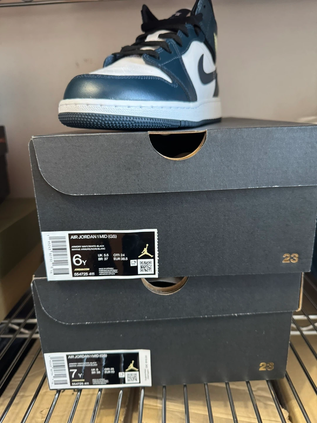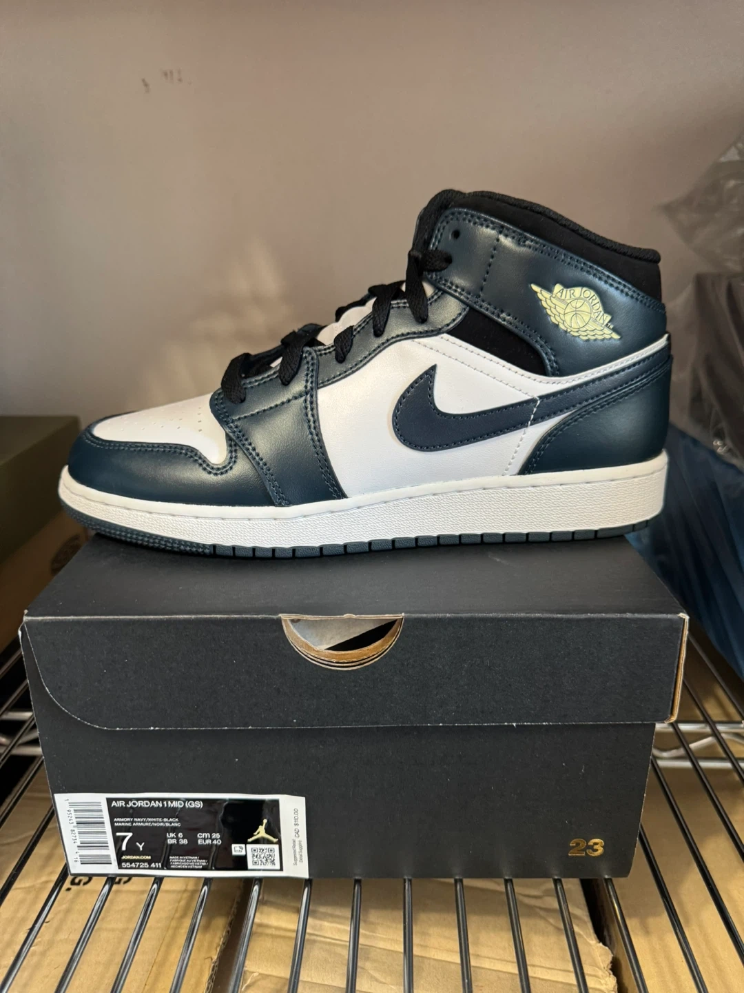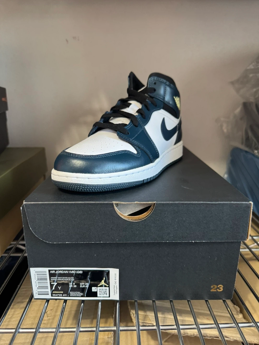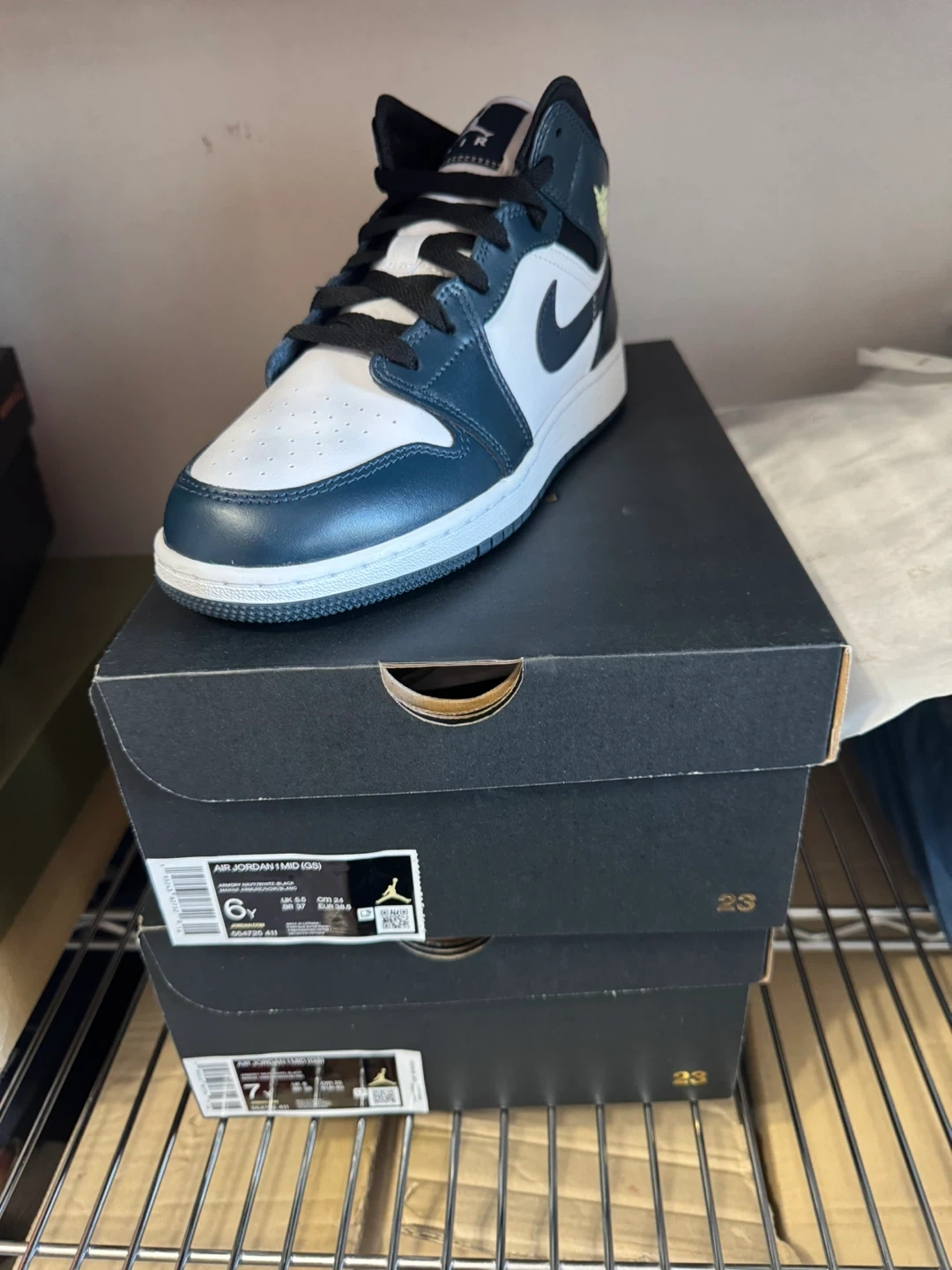 6Y and available Retails 120+tax Brand new Pick up or + label for ship 100% authentic Selling a pair of Air Jordan 1 Mid (GS) in size 6Y. The shoes are in great condition and come with the original box. They feature a stylish navy, white, and black colourway. Perfect for any sneakerhead!