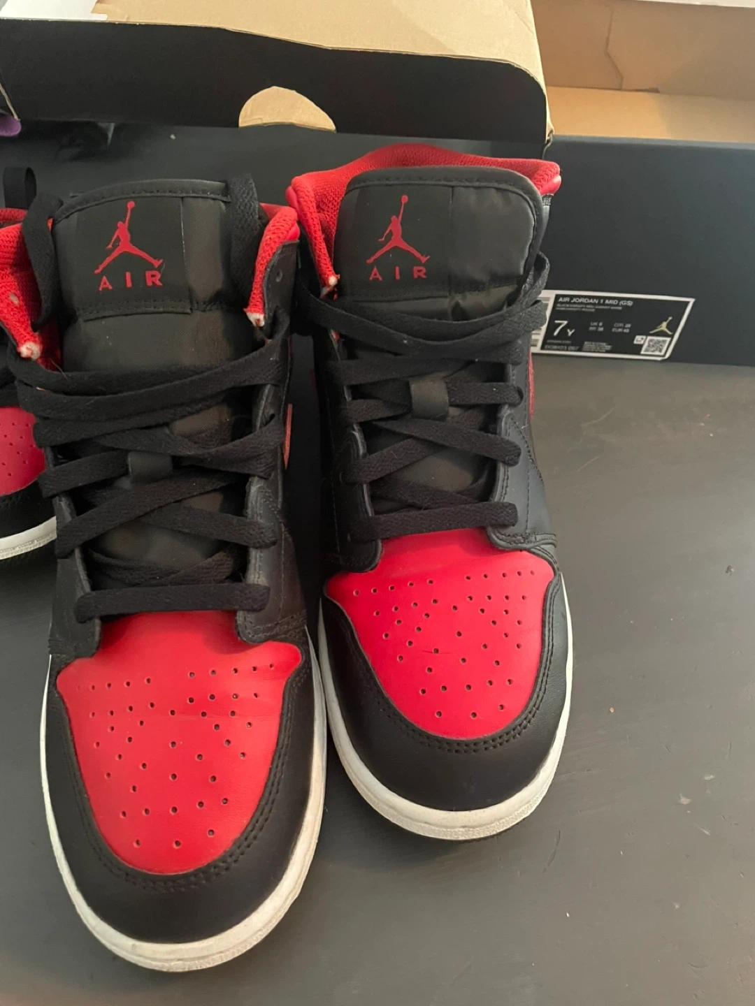 65Selling a pair of youth Air Jordan 1 Mid sneakers in size 7Y. They come in the original box and are in great condition. The colourway features a classic black and red design.