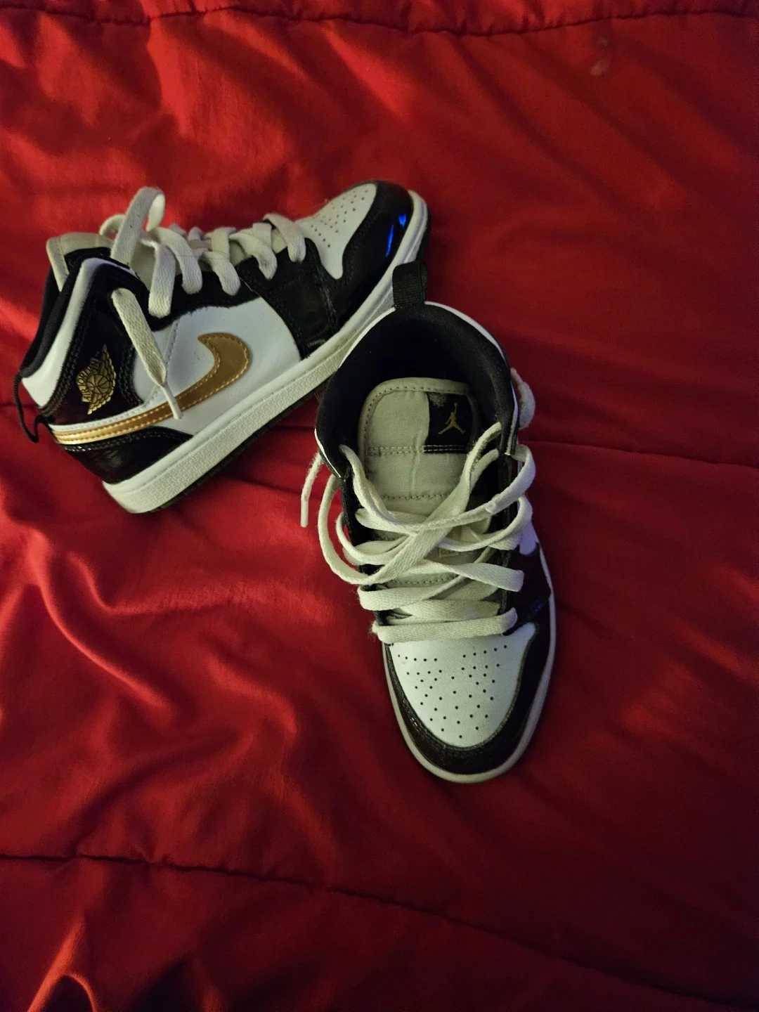 72Selling a pair of aiir Jordan 1 Mid sneakers. They are black and white with gold accents. Great for your little one! Size 13 c