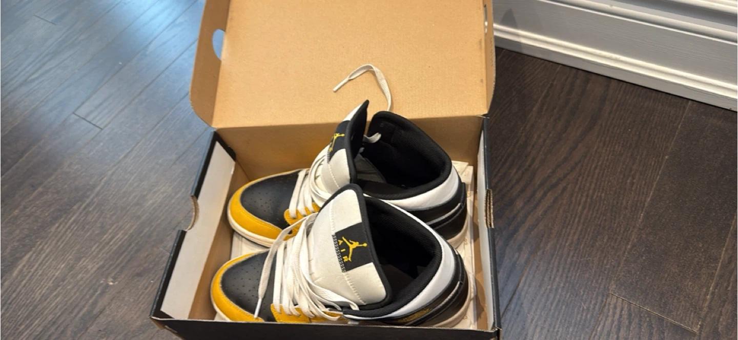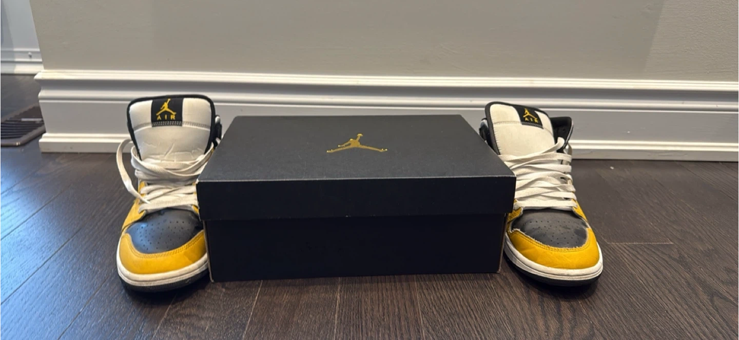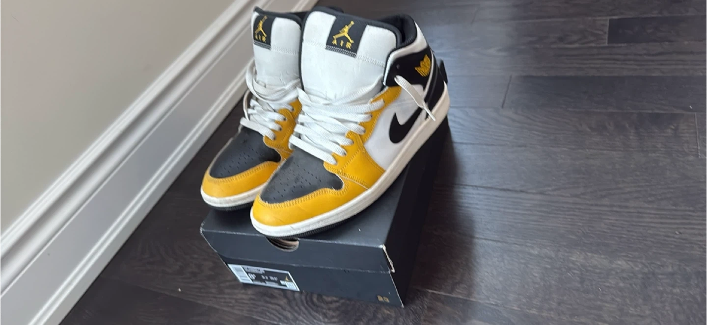 0Selling a pair of Air Jordan 1 Mid sneakers in the Taxi, Black, and White colourway. They are a US size 8.5 and come with the original box!
